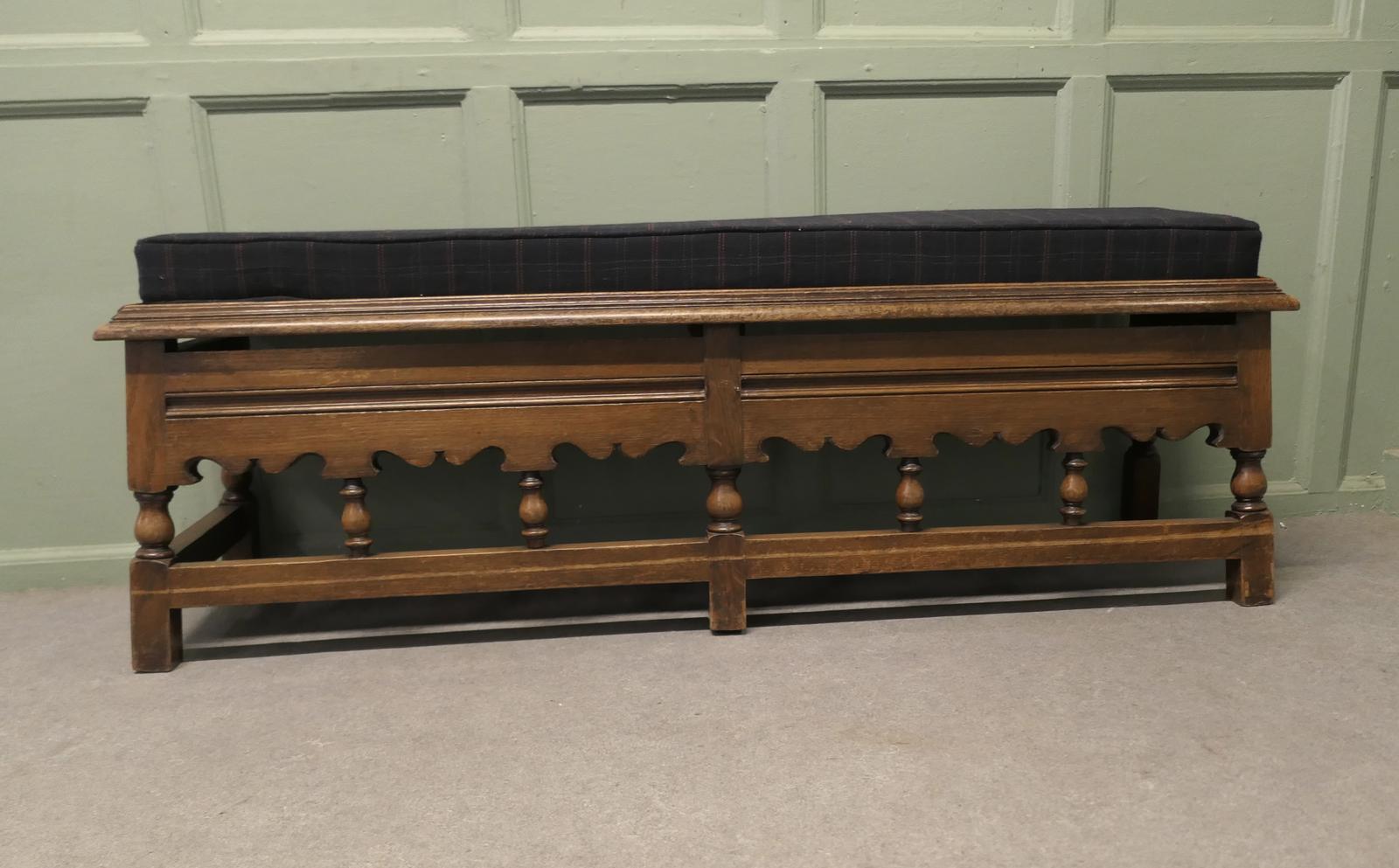 A handsome country piece with turned uprights and a very attractive seat, the bench can be arranged with the open side out or to the wall, with the open side accessible it will store boots and shoes underneath