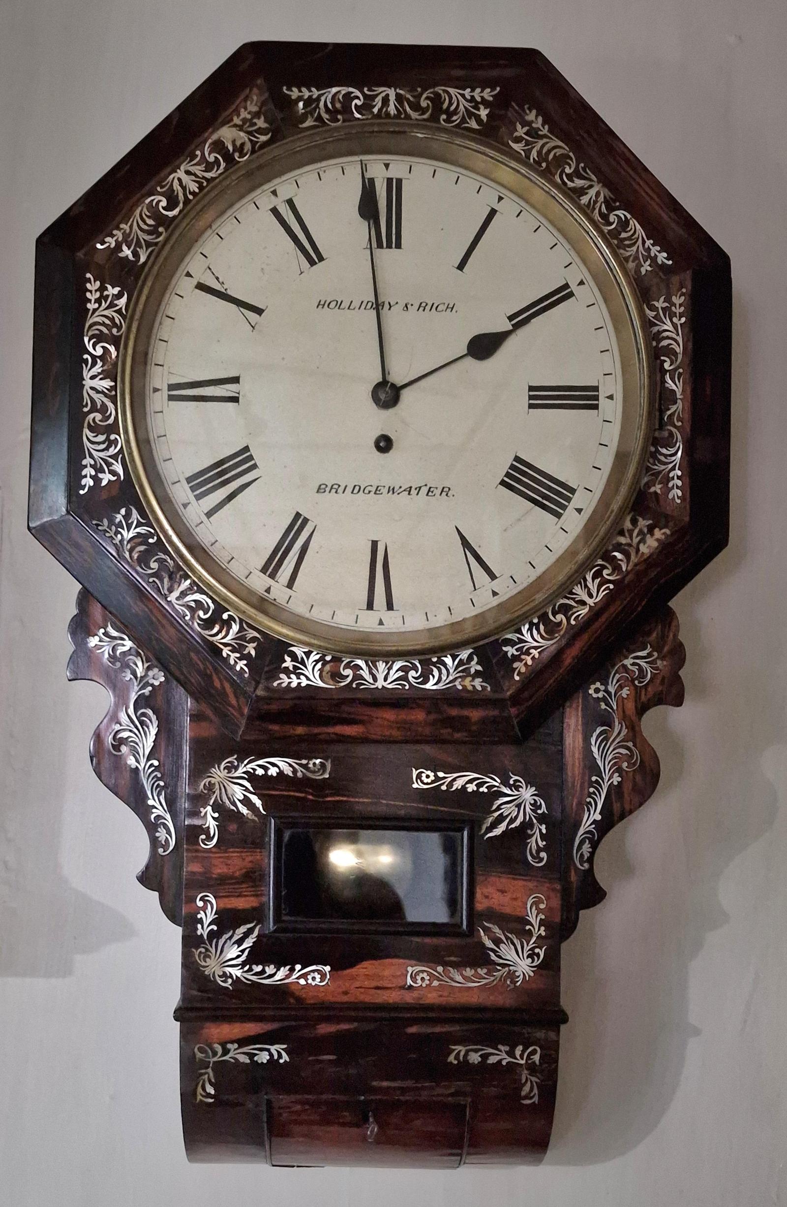 An early Victorian fusee drop dial wall clock. A 12" painted dial signed 'HALLIDAY & RICH, BRIDGWATER' with blued steel hands. A lovely quality coromandel case with choice veneers. Mother of pearl inlaid case. A cast brass bezel surround. The original side carvings to the base with a pendulum window.