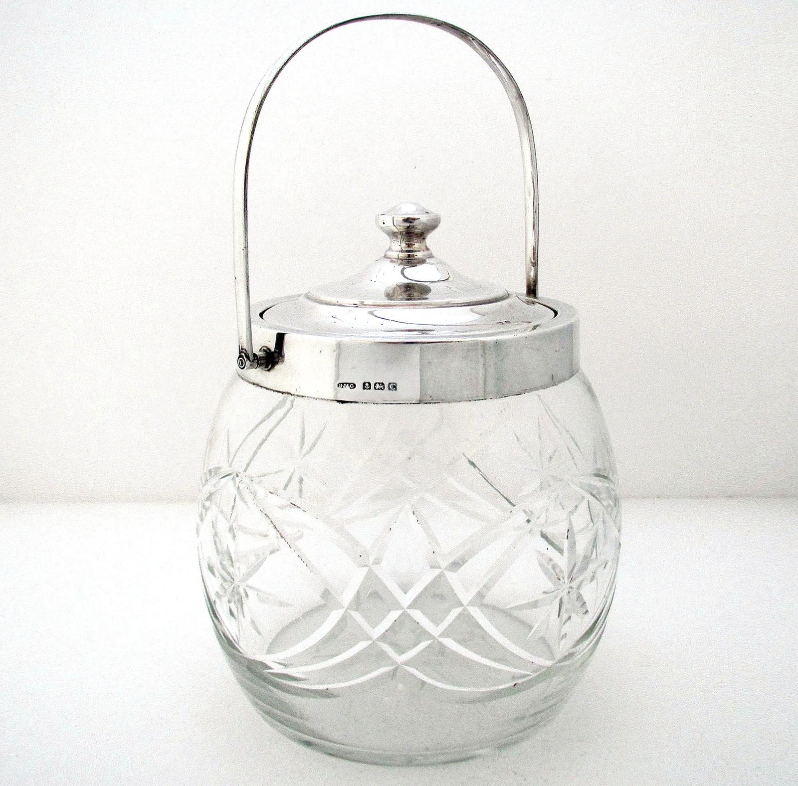 Hallmarked (1927) Solid Sterling Silver Mounted & Cut Glass Biscuit Barrel Cookie Jar Box Container