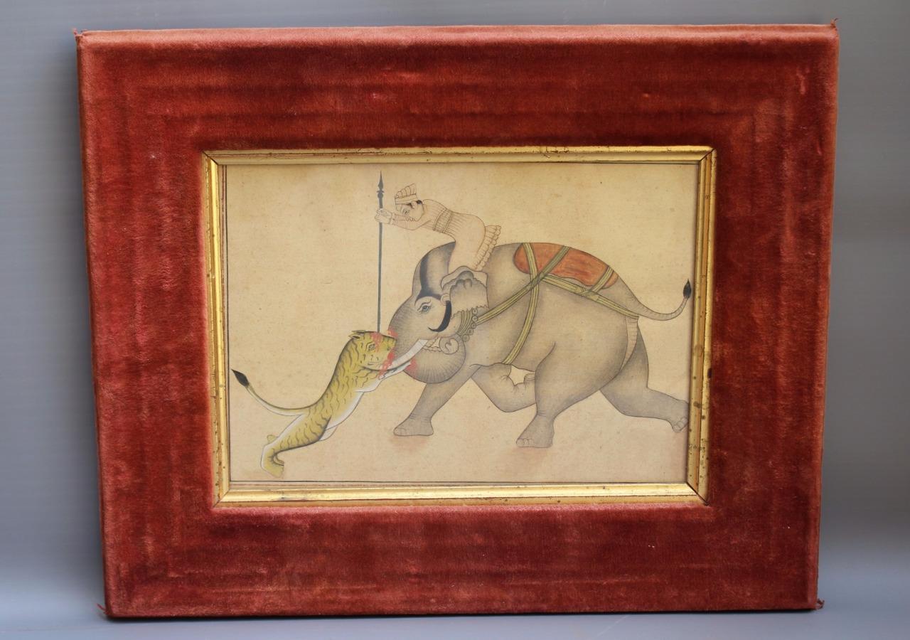 Hand Coloured Indian Print Elephant and Tiger Velvet Frame (1 of 1)