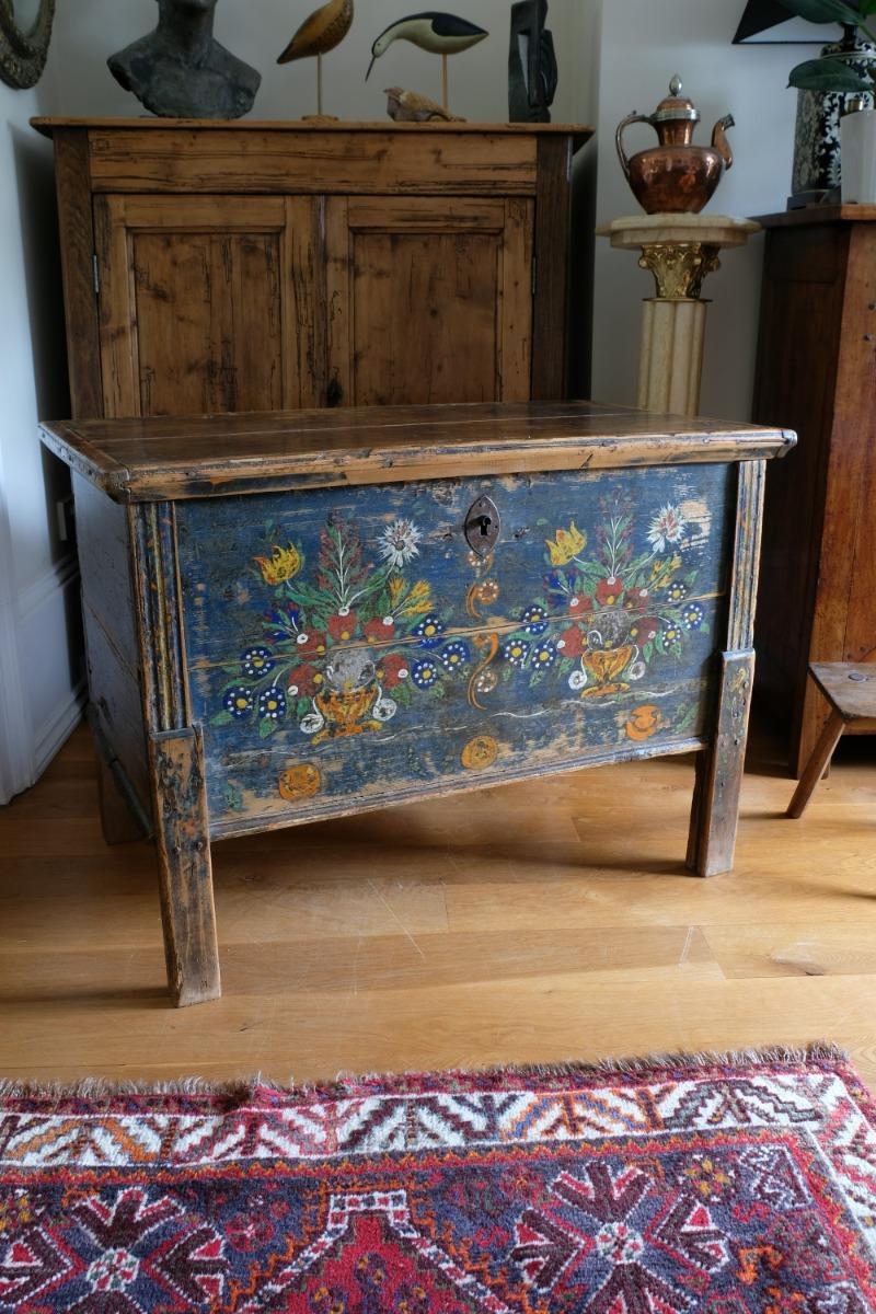 Hand Painted Folk Art Storage Coffer Raised on Legs