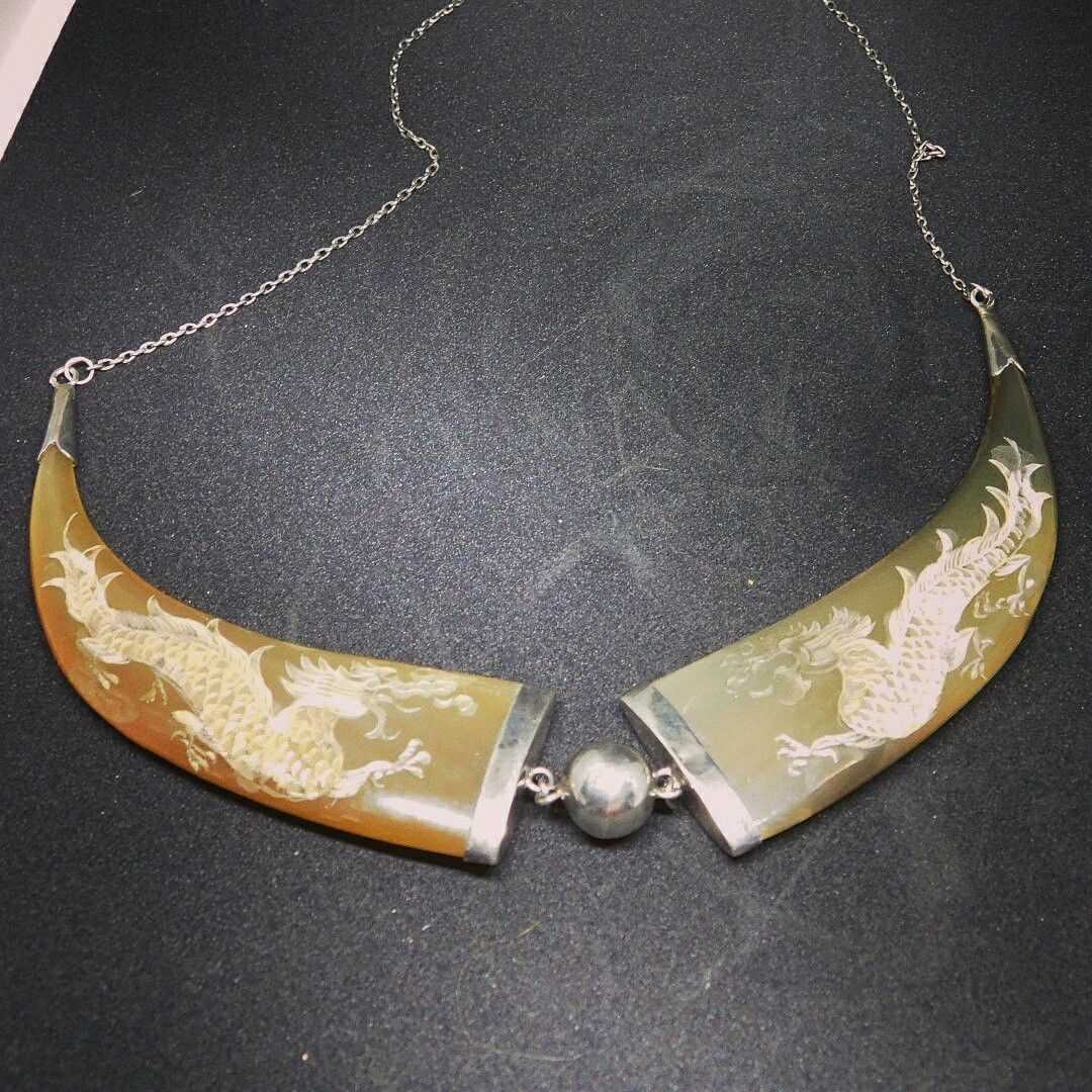 Handcarved Horn Necklace Chinese and Marked Silver