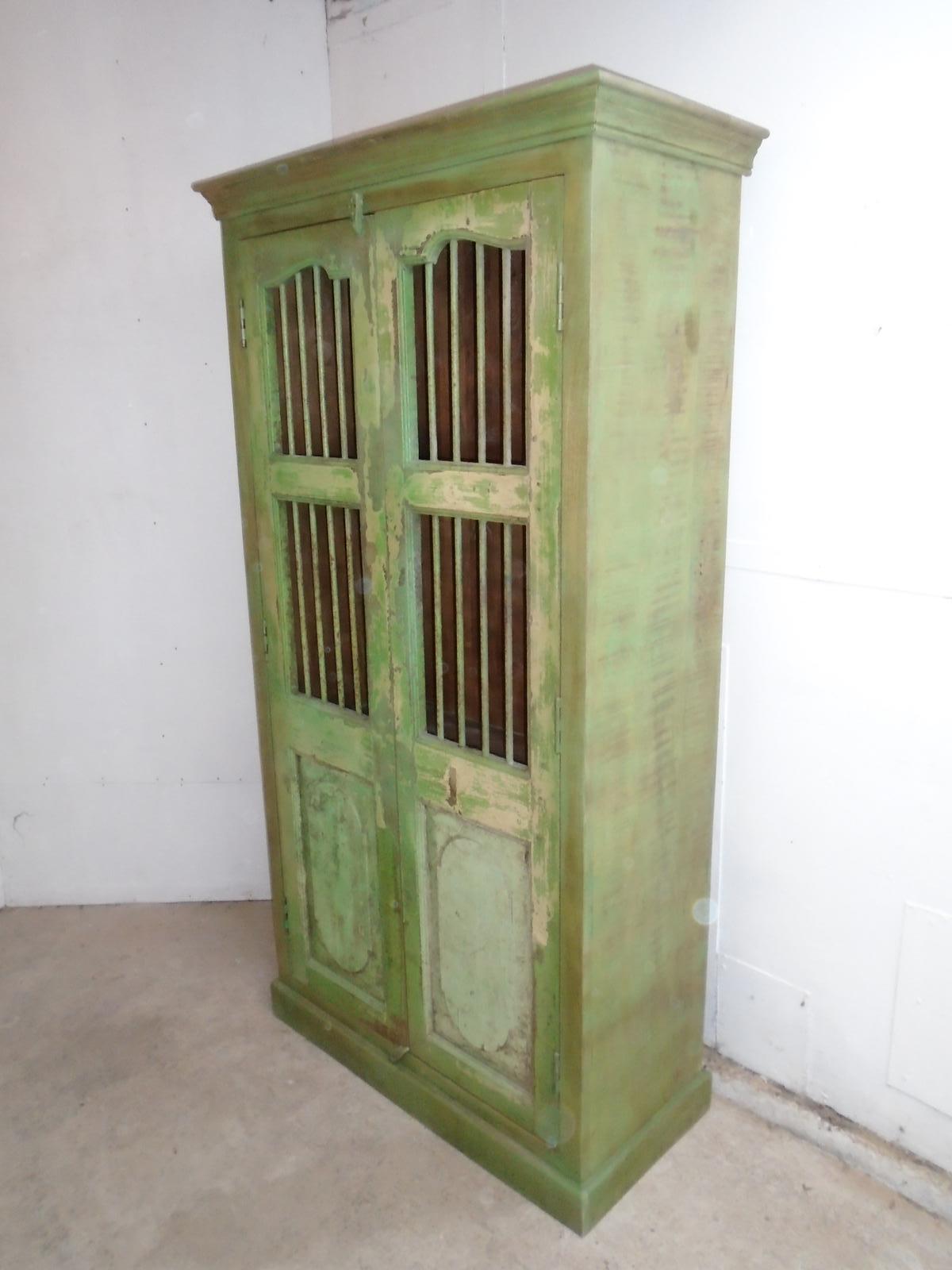 Handmade Indian Mango & Teak Grill Painted Green 2 Door Kitchen Cupboard