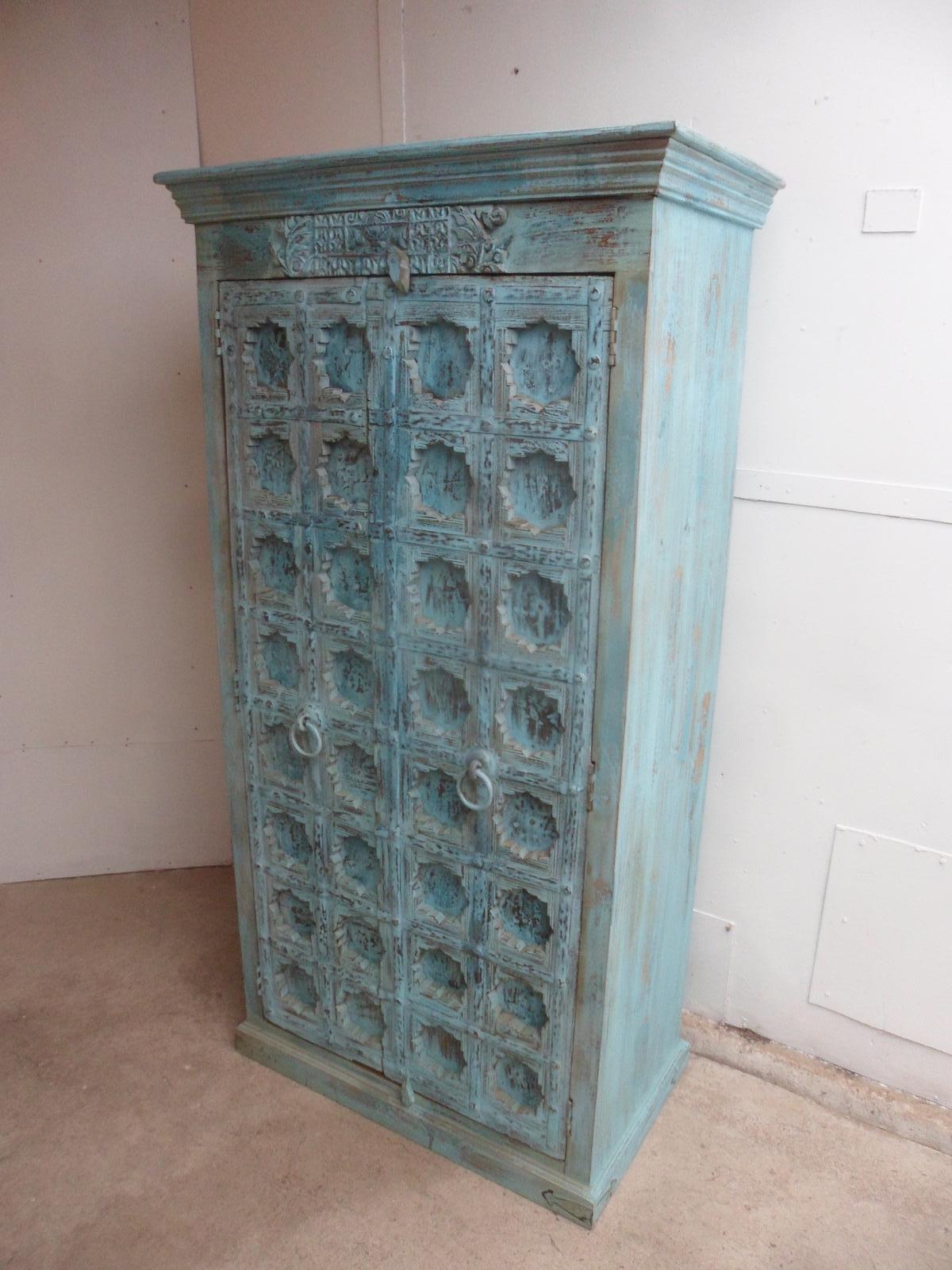 Handmade Indian Mango & Teak Large Painted Coral Blue 2 Door Storage Cupboard