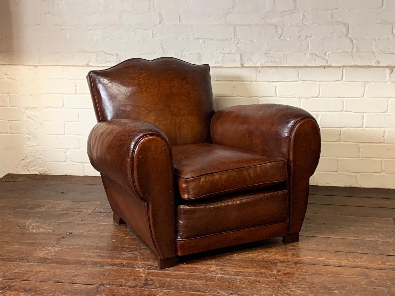 A Very Beautiful French Leather Club Chair Havana Moustache Model Circa 1930’s