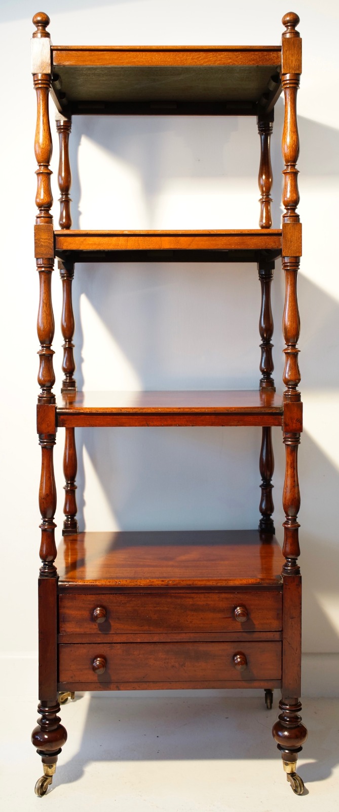 Handsome Tall Mahogany Whatnot with Two Drawers Raised on Turned Feet Terminating on Barrel Brass Castors