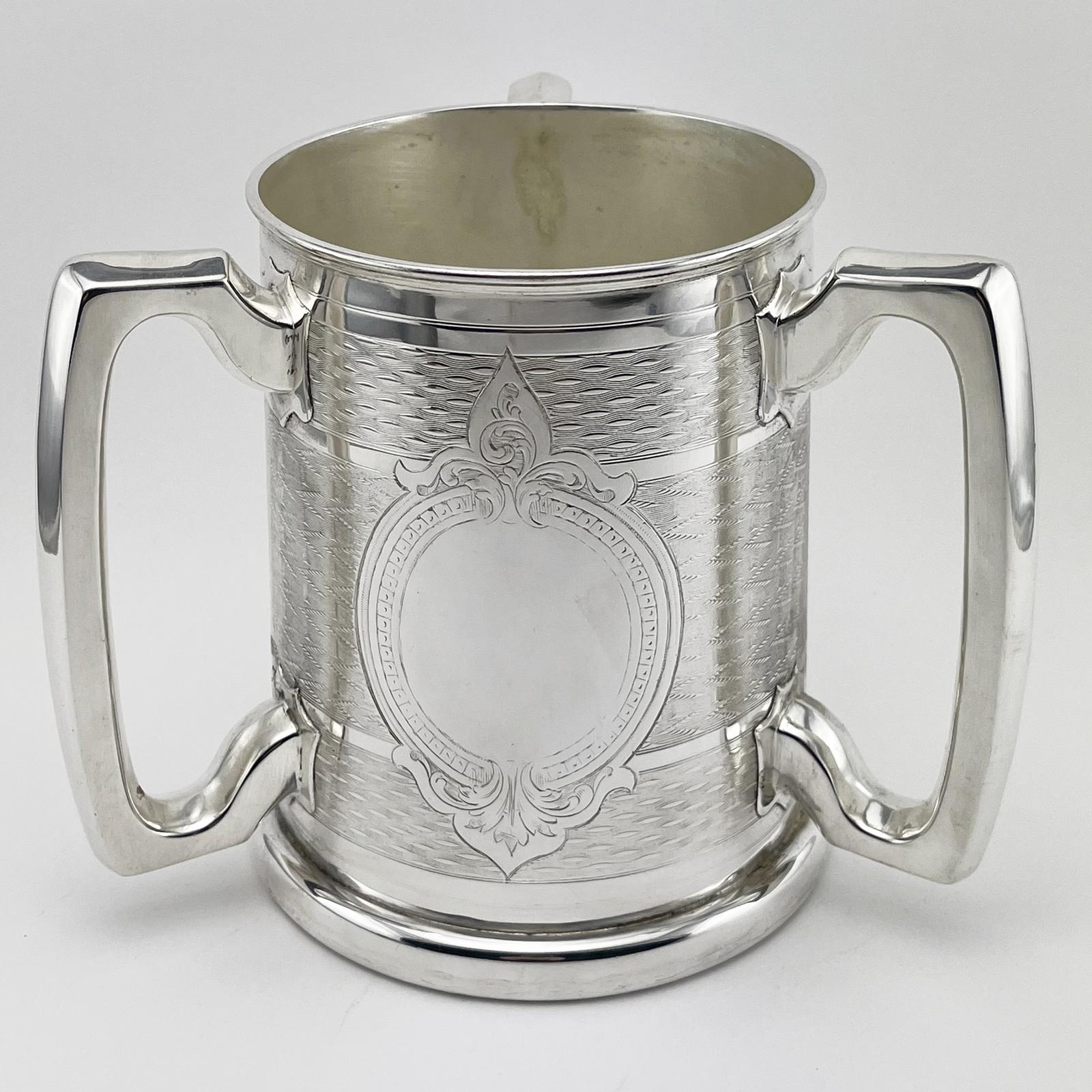 A very handsome Victorian silver plated loving cup. Cylindrical tapered body with engine turned decorative bands around the body and a central vacant cartouche. Three angled style handles applied to the body with a star cut glass base. In very good re silver plated condition.