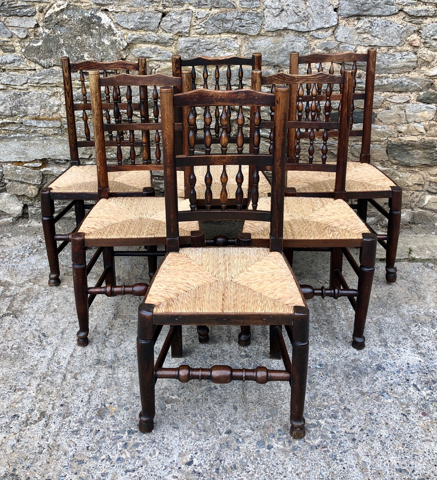 Harlequin Set of 6 Antique Rush Seat Spindle Back Chairs