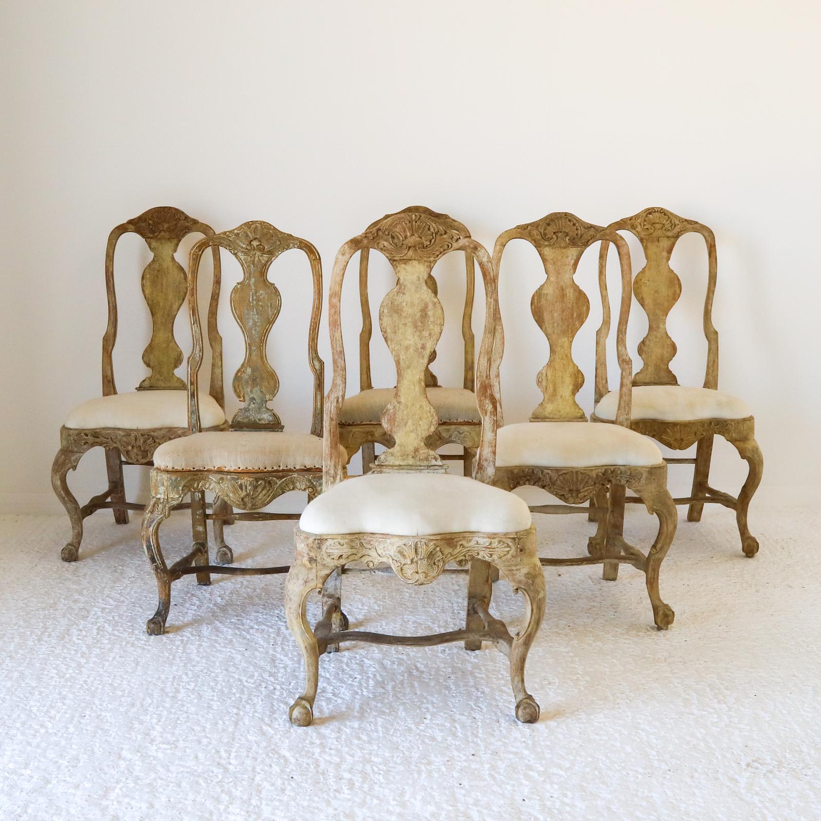 Harlequin Set of 6 Swedish 18th Century Dining Chairs Original Scraped Back Paint