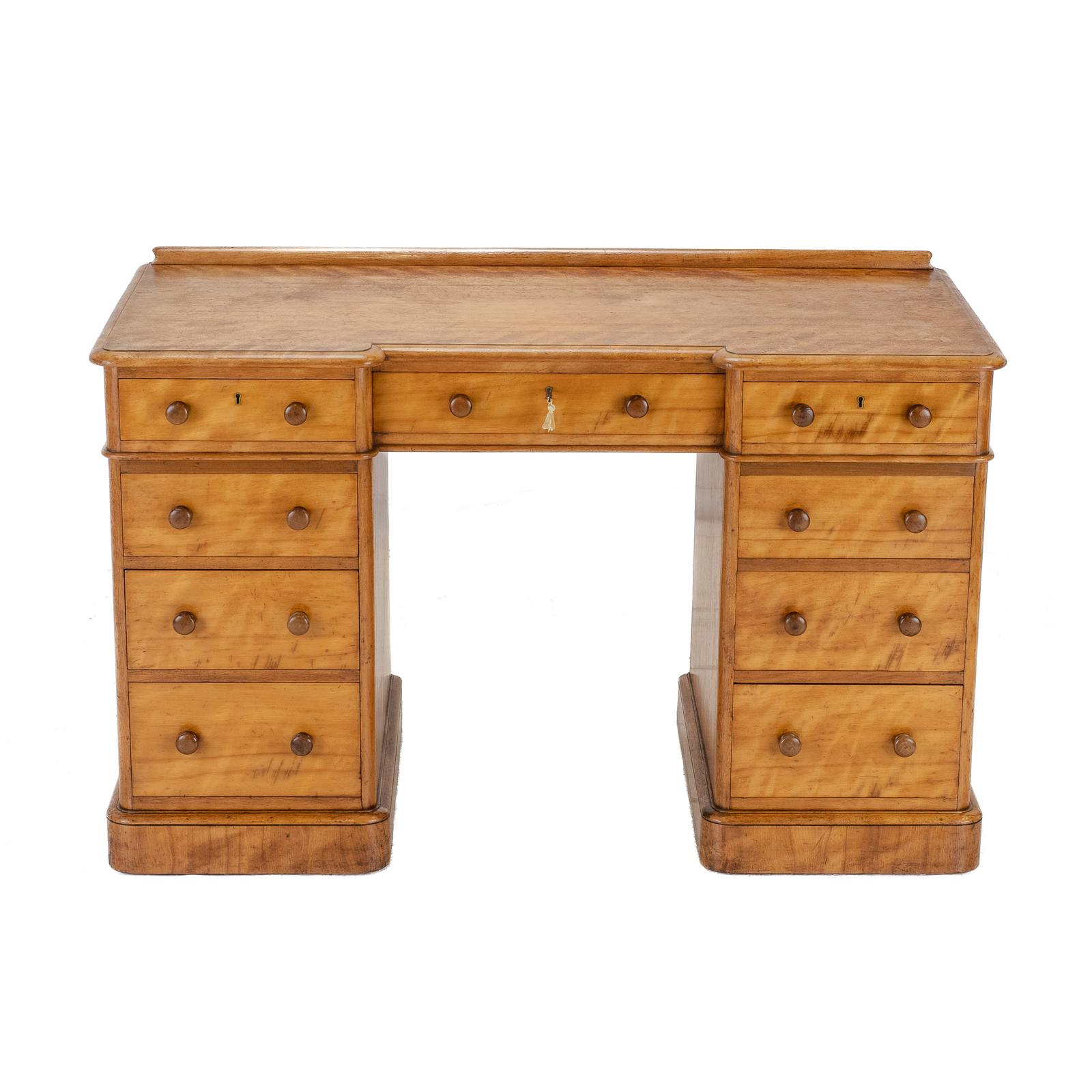 In good, fully functional condition, consistent with long and honest use. The satinwood retains its original finish and shows scattered marks, blemishes and gentle surface wear developed over time, all characteristic of well-used late Victorian furniture and contributing to the desk’s warmth and charm. Around the lower edges of the plinth bases are small veneer chips and losses, all stable and photographed clearly for accuracy.