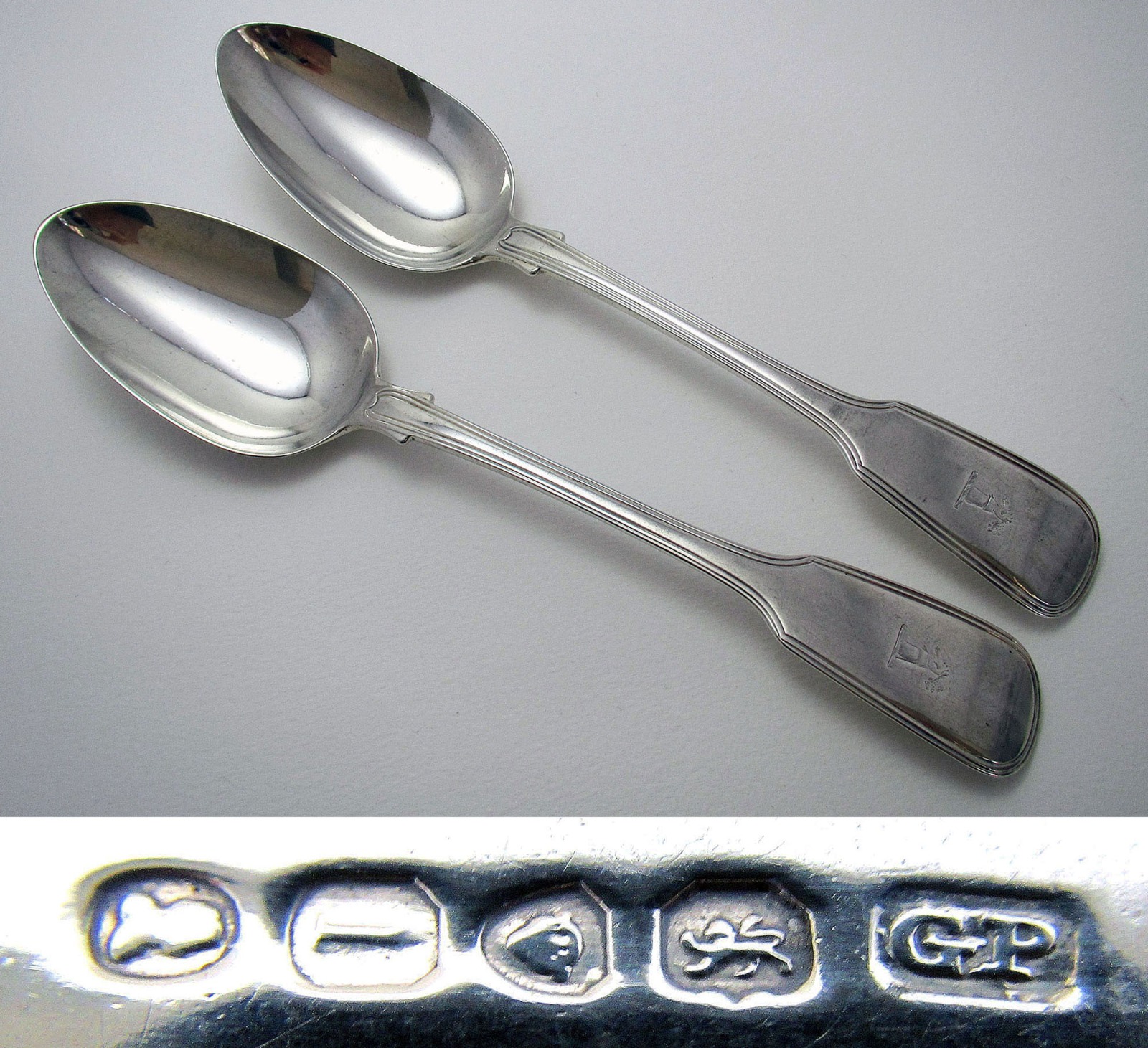 Heavy Pair 154G! of Georgian "Fiddle Thread" Pattern Solid Sterling Silver Table Serving Spoons, English London 1826 Hallmarked.
