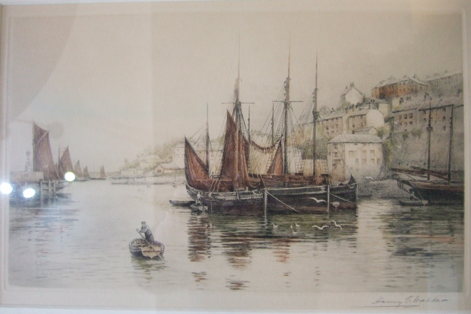 Henry George Walker - Coloured Etching of Fishing Boats in Harbour 1920s