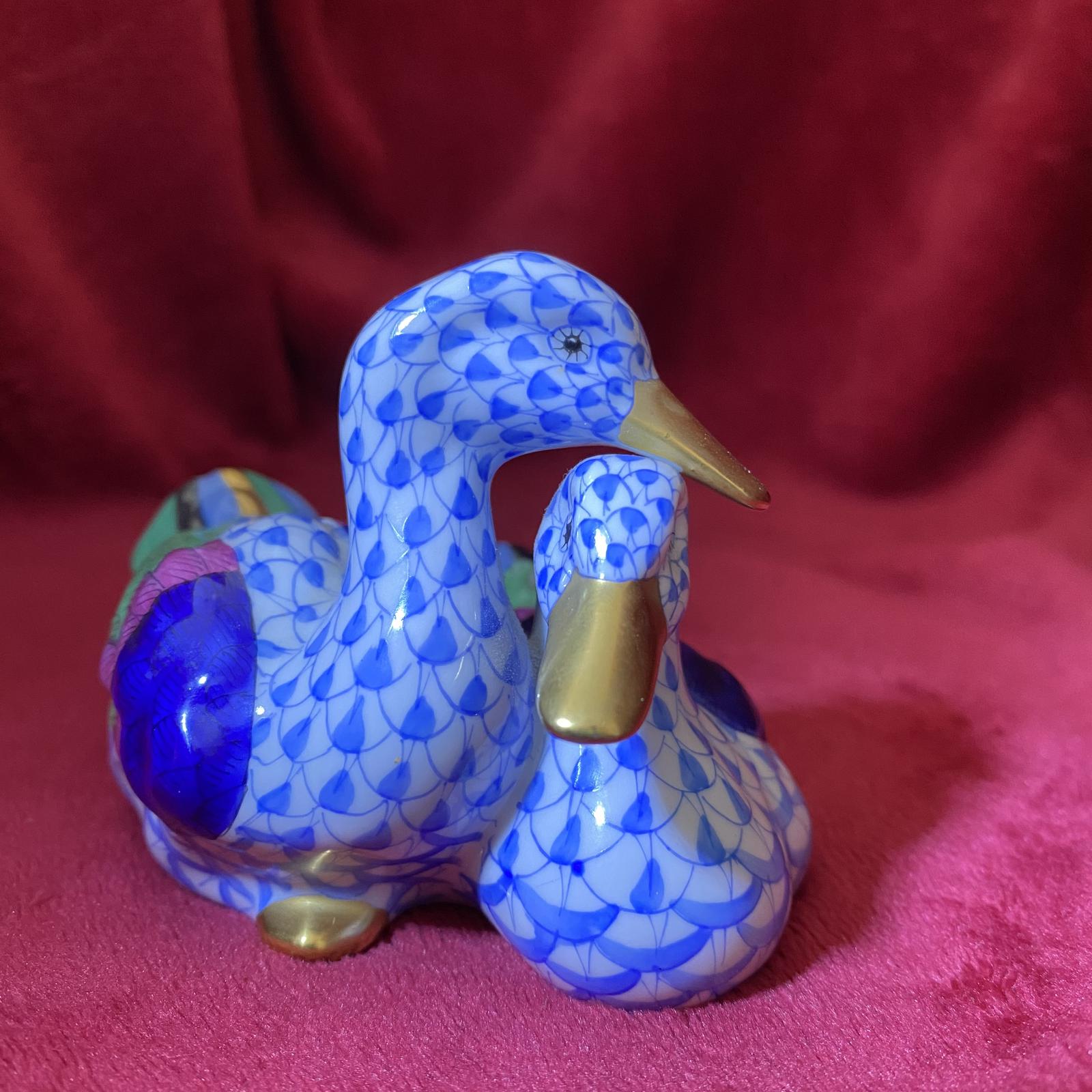 Herend Blue Fishnet Pattern Model of Two Ducks