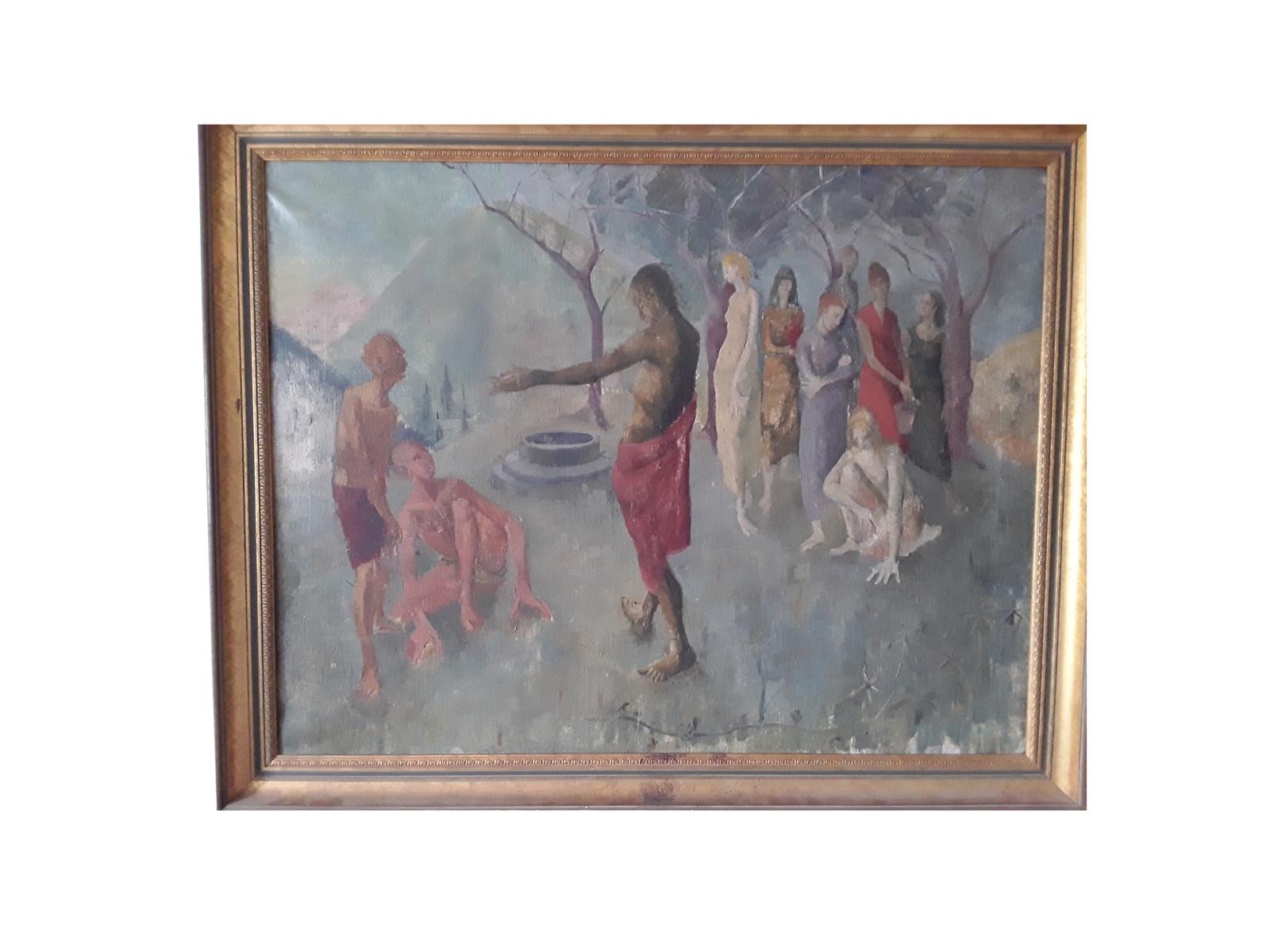 A contemplative Biblical composition by Hickey, titled “Figures by a Well.” Executed in oil on canvas, the work gathers elongated figures around a circular well, the central protagonist extending an arm in a gesture of grace. Muted tones and rhythmic silhouettes evoke mid-20th-century modernism, balancing narrative and atmosphere.