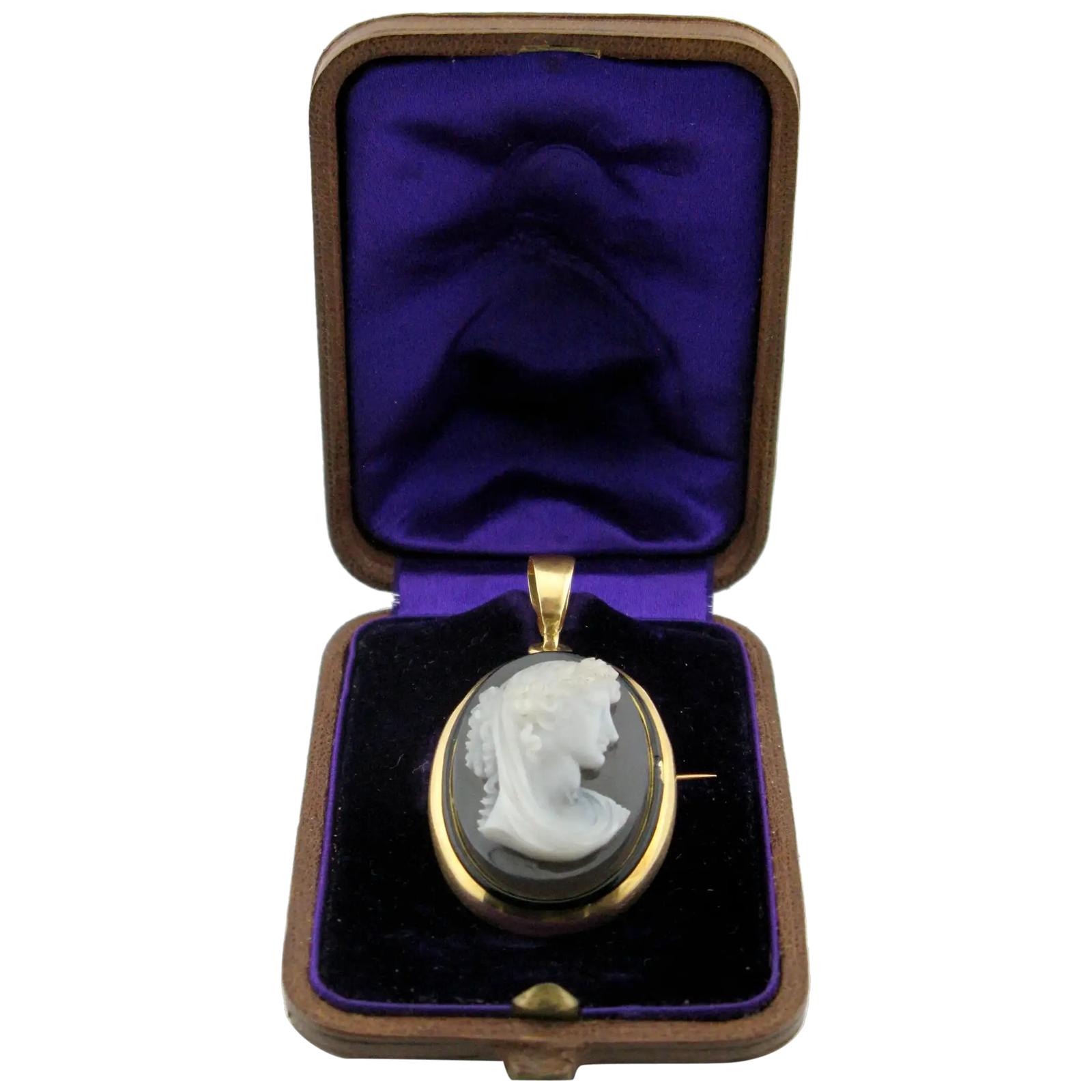 High Relief 19th Century Agate 18ct Gold Cameo Brooch Pendant Cased