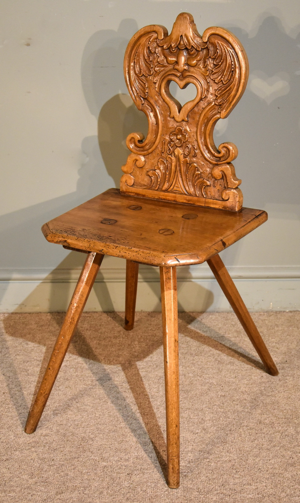 Highly Unusual Swiss Carved Solid Walnut Hall Chair