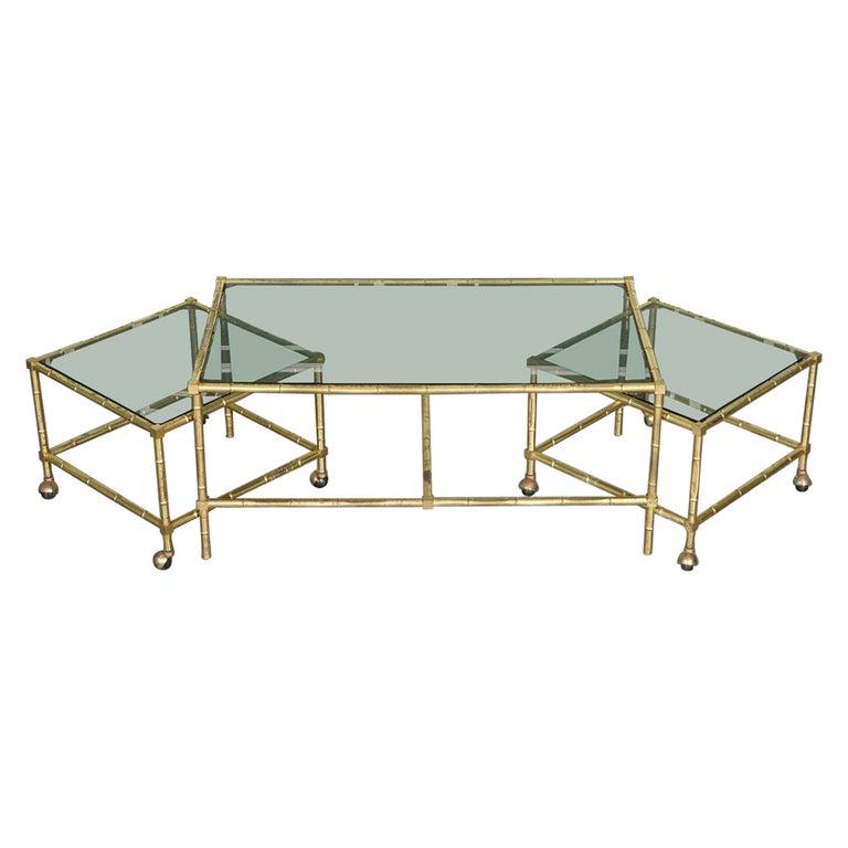 Hollywood Regency Golden Bamboo Coffee Table Set with 2 Side Tables on Castors