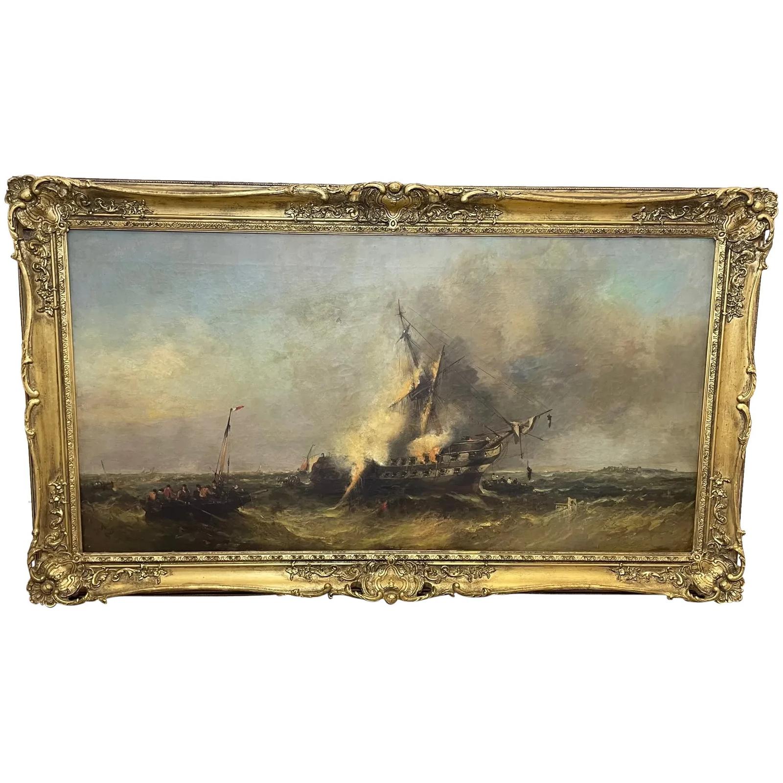 Huge 19th Century Dramatic Marine Oil Painting Ablaze Ship by William McAlpine