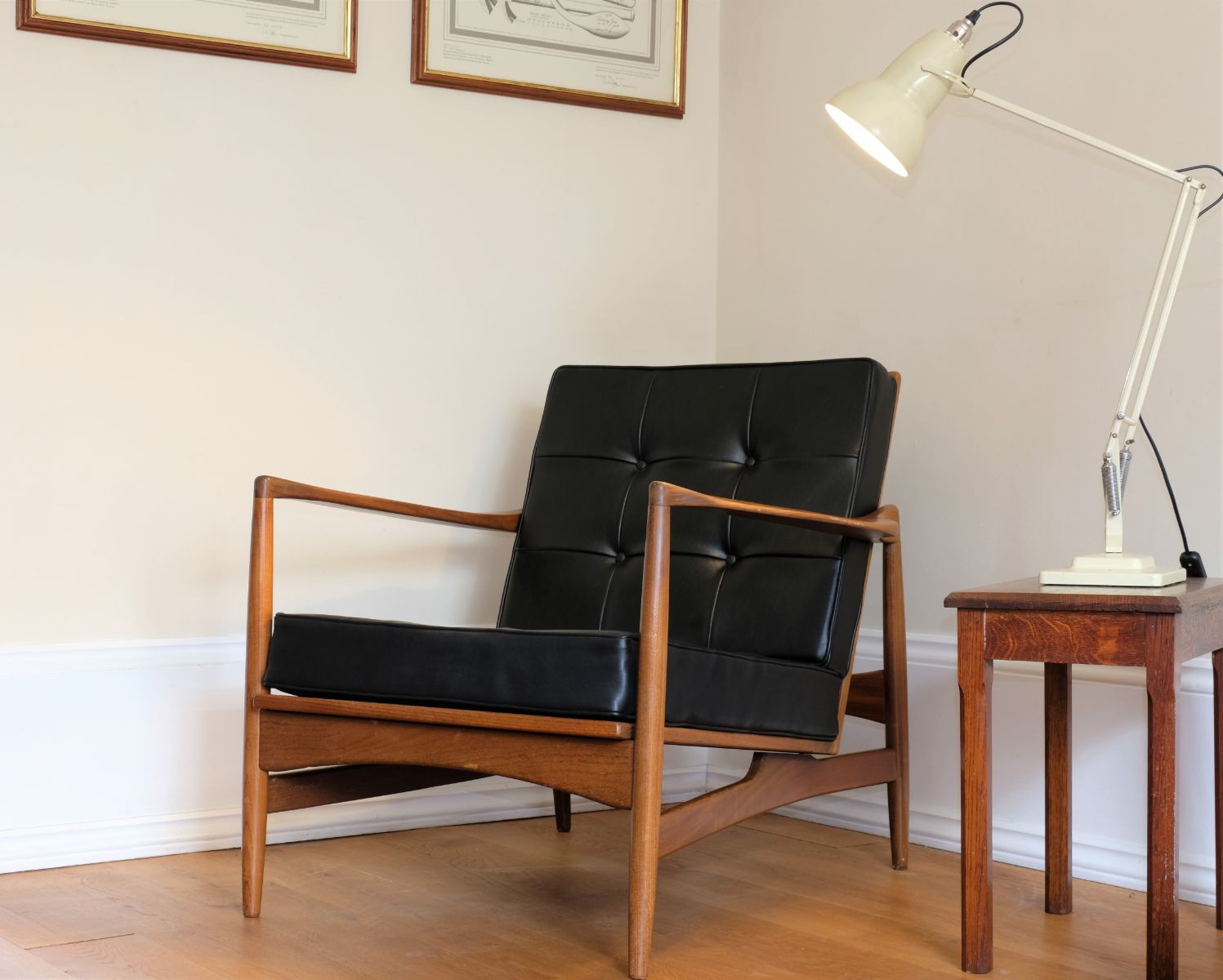 Ib Kofod-Larsen Teak Open Armchair with Black Button Backed Cushions Designed For G-Plan C.1965