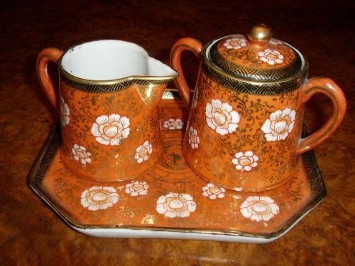 Imari Flower Pattern Japanese Porcelain Miniature Tray, Milk Jug & Sugar Pot c.1920