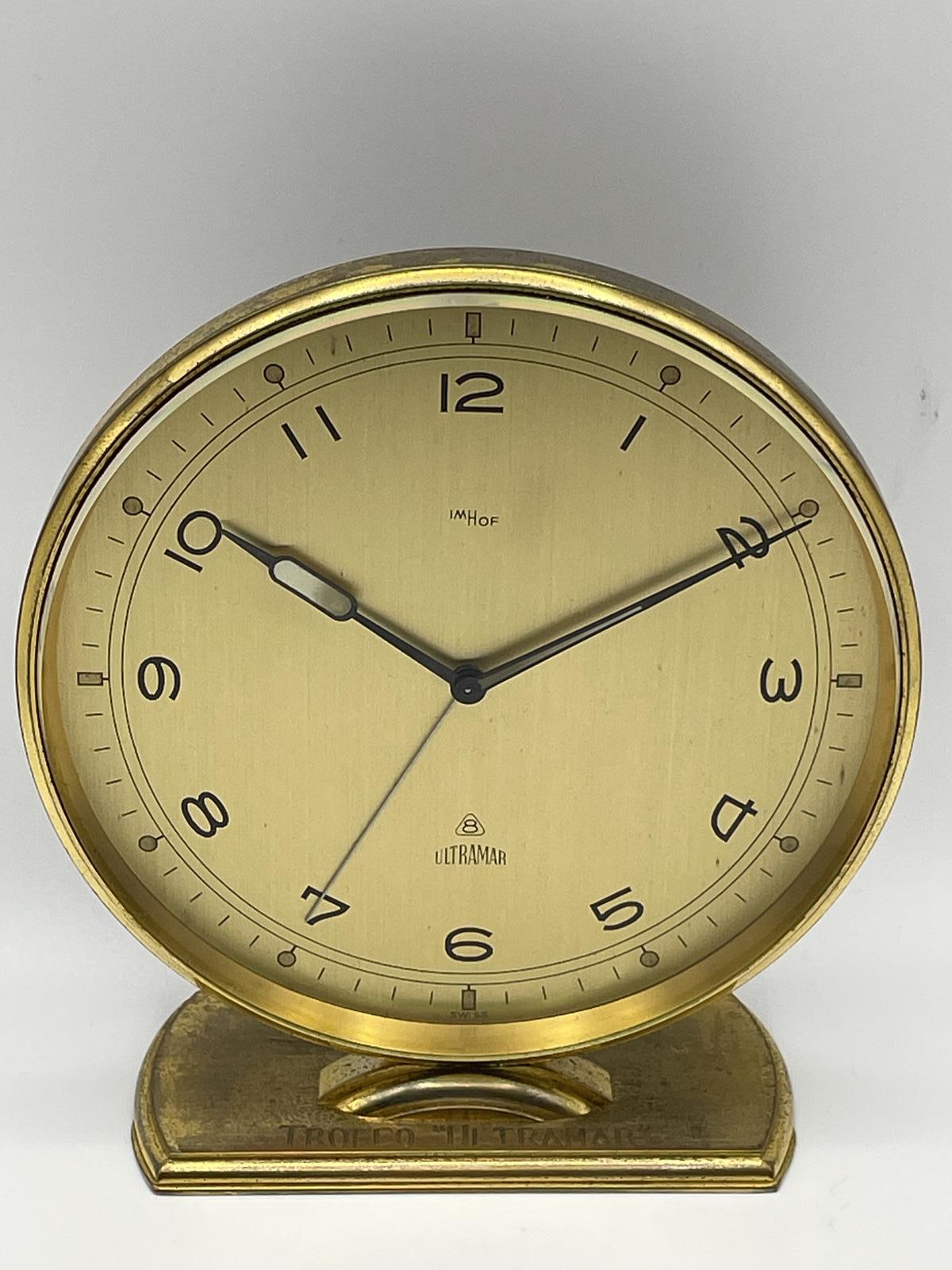 A small clock by the renowned Swiss maker Imhof. Has an alarm facility that unfortunately is not functioning correctly but the 8 day movement is running well and keeping reasonable time but untouched by us so carries no guarantee other than those offered regards "Distance Selling Regulations".