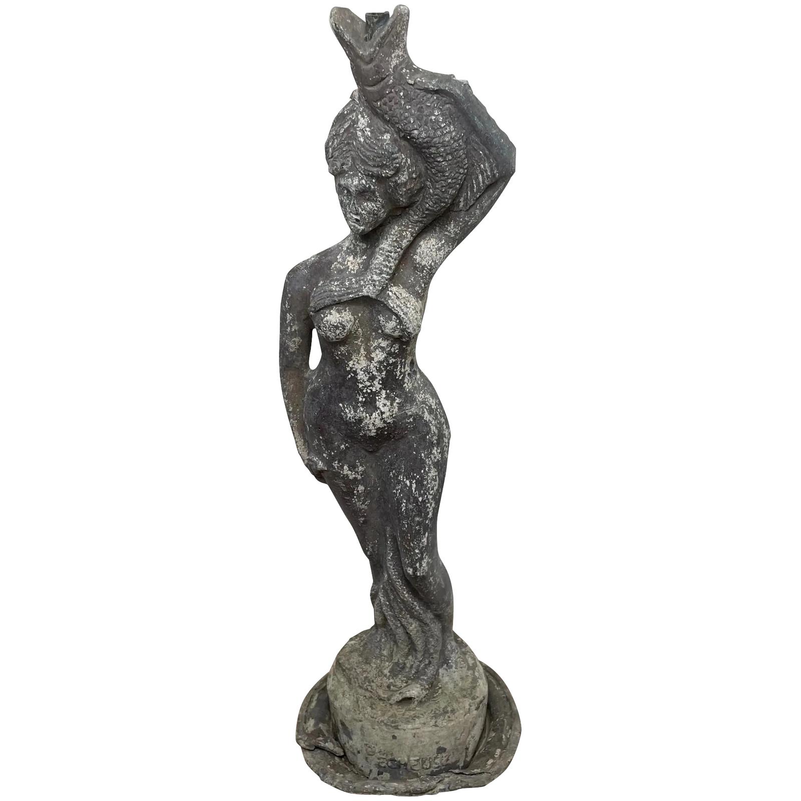 Important 19th Century French Garden Fountain Spout Lead Lady "The Fisherwoman"