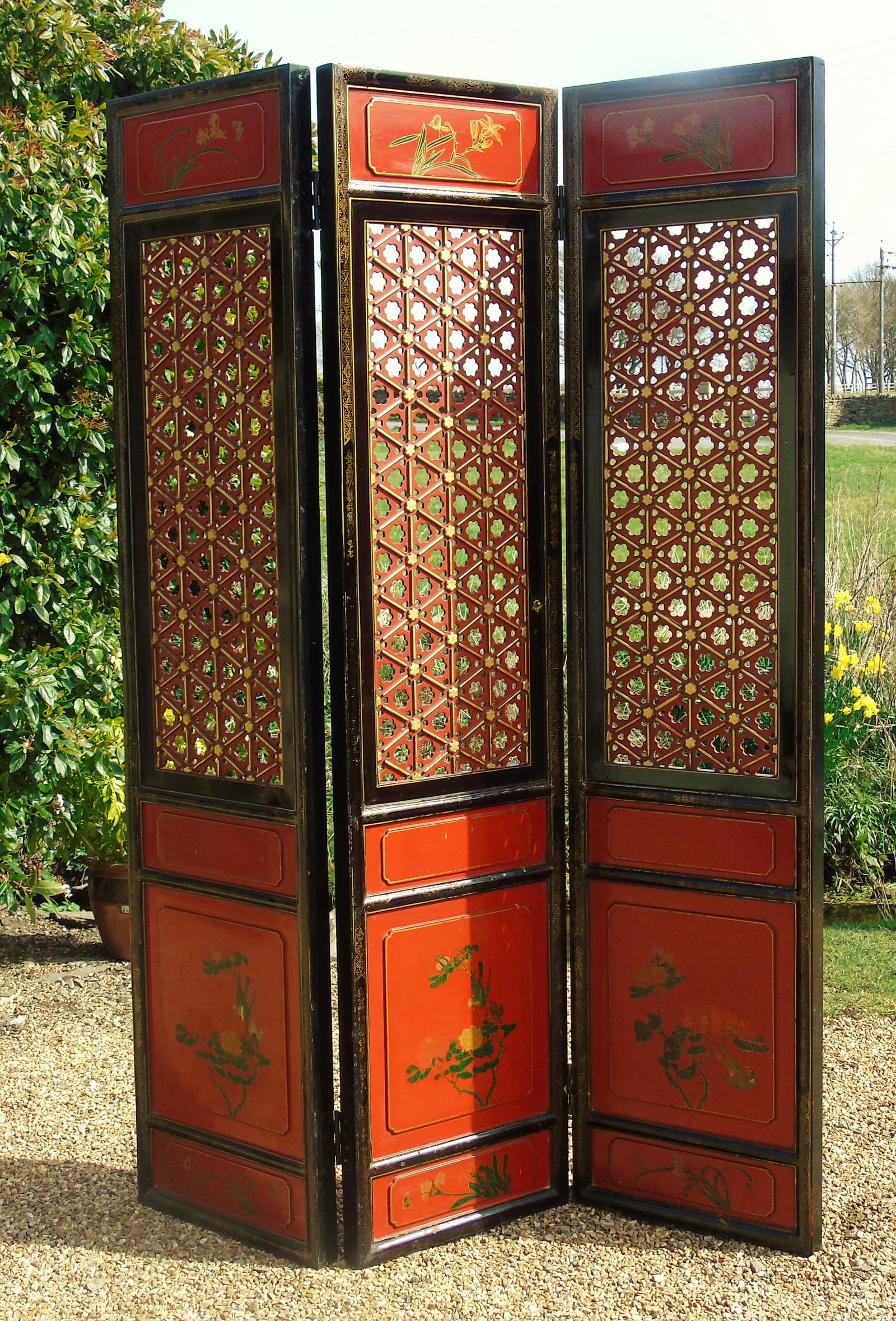 Impressive Antique Chinese 3 Panel Gilt and Red Lacquer Screen