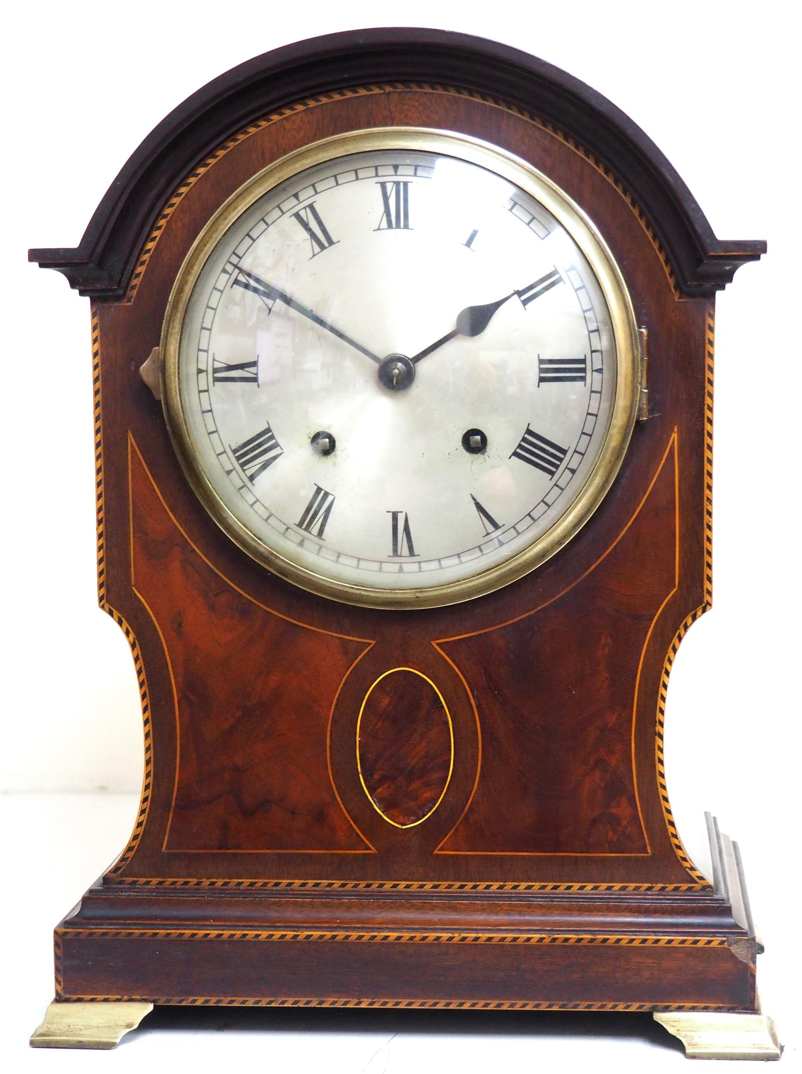 Impressive Arched Top Mahogany Inlaid 8 Day Striking Mantle Clock