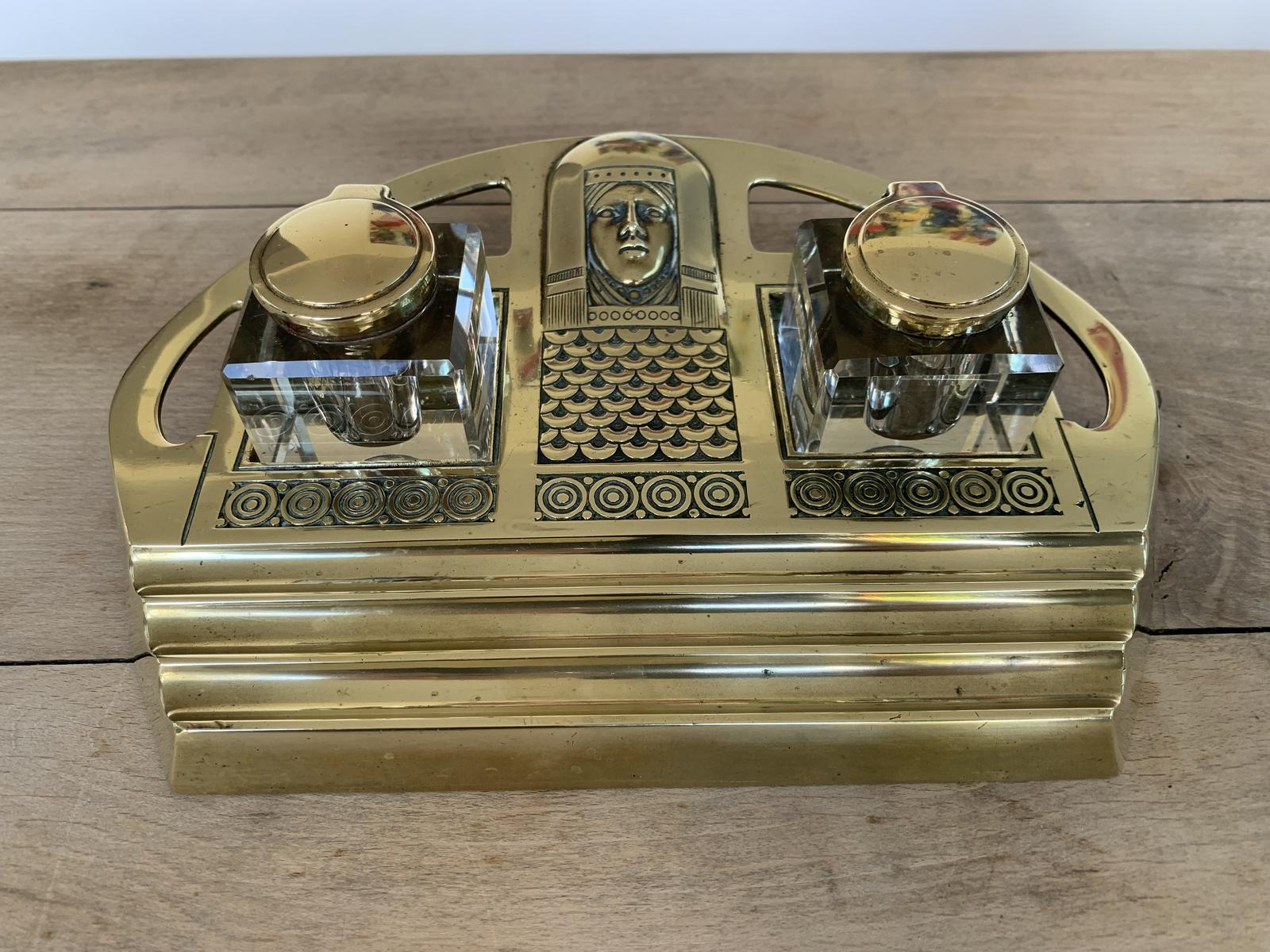 Impressive Austrian Brass & Cut Glass Secessionist Inkstand with Two Glass Inkwells