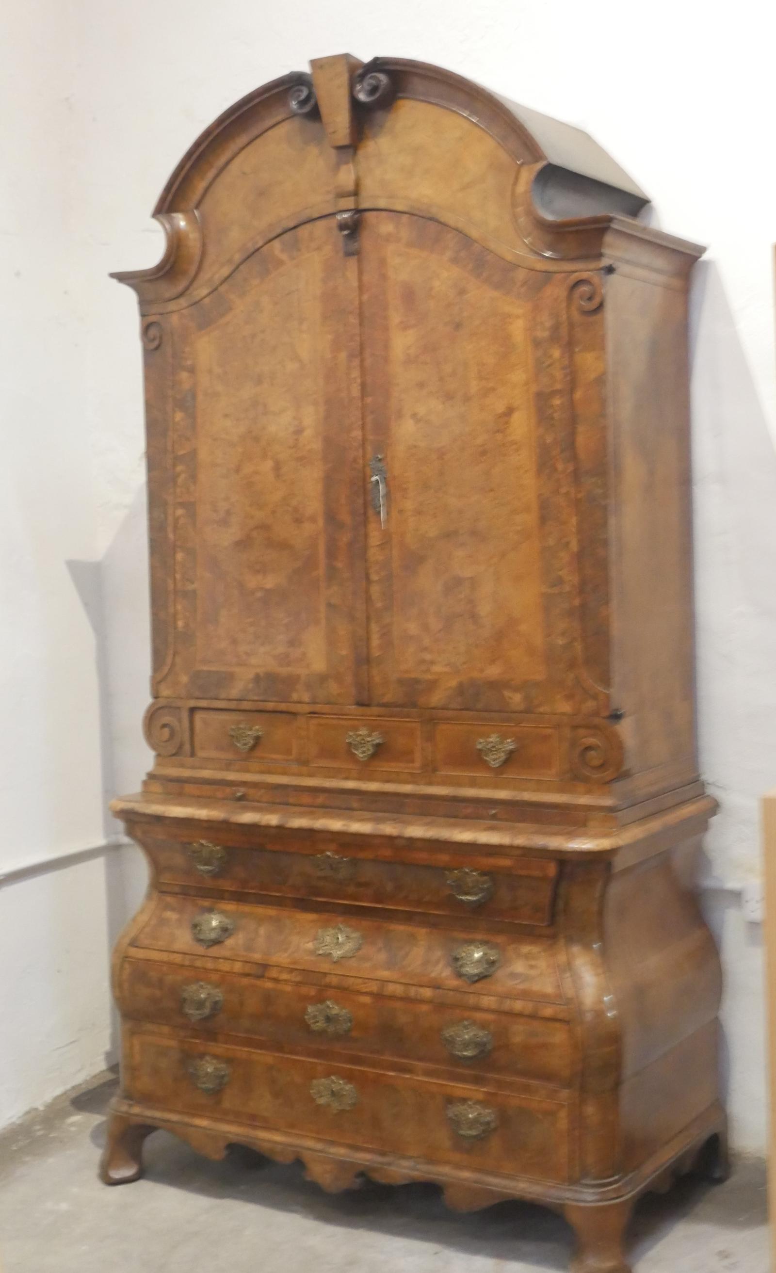 A very impressive 18th century Dutch walnut two part cabinet, made in Amsterdam. Adjustable shelves to the top, with drawers beneath, a bombe shaped chest to the base, oak lined, the cabinet shows similarity to a Dutch cabinet in the Rijksmuseum in Amsterdam.