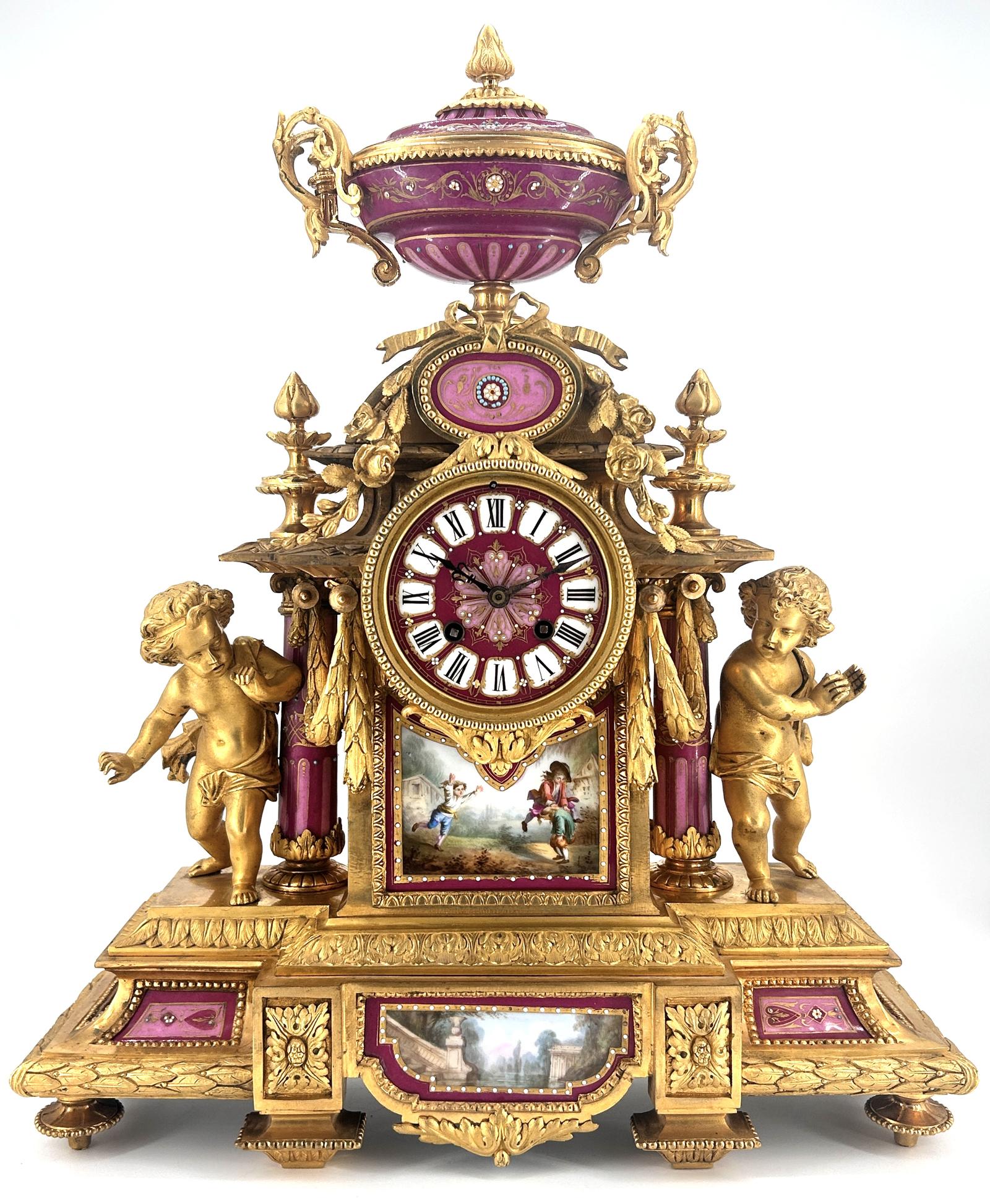 Impressive Ormolu French Antique 8-day Striking Red Sevres Mantle Clock c.1860