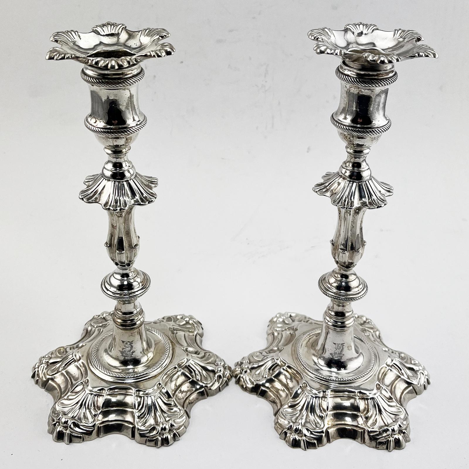 An impressive pair of late George II (1756) cast candlesticks by the renowned silversmith John Cafe. With detachable circular shaped and shell style border one with a lion passant and the other unmarked. The capitals have a rope work border and the knopped stems have shell decoration. The shaped cast bases have matching family crests, alternating shell motif decoration and hallmarked on the underside of the bases. Both candlesticks are in very good original condition.