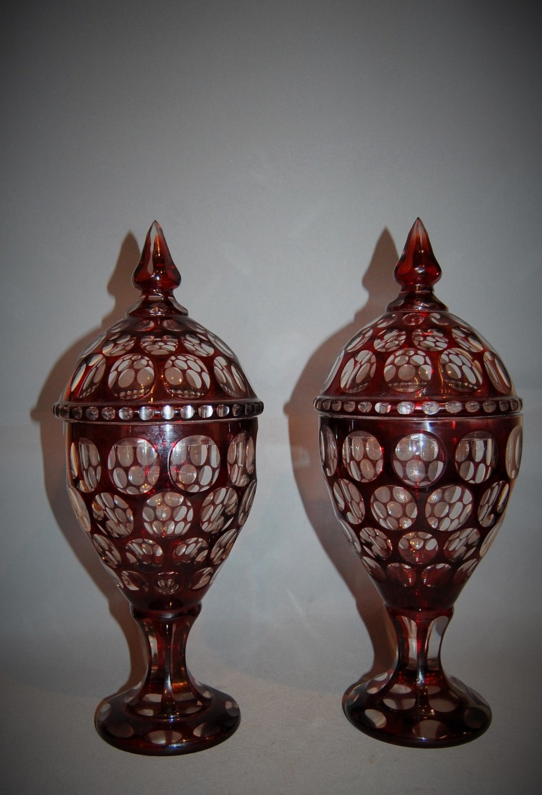Impressive Pair of Red Glass 19th Century Bohemian Covered Jars