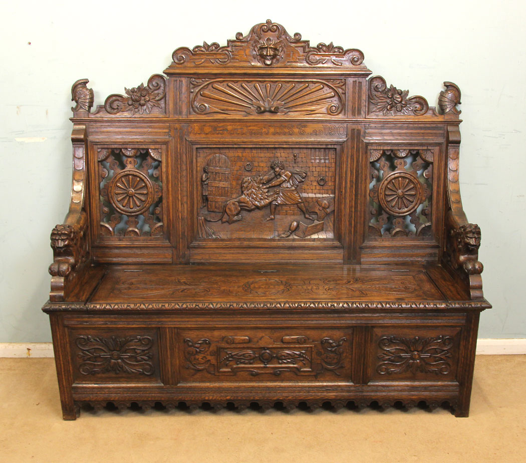 Impressive Victorian Carved Oak Settle / Monks Bench / Hall Seat (1 of 1)