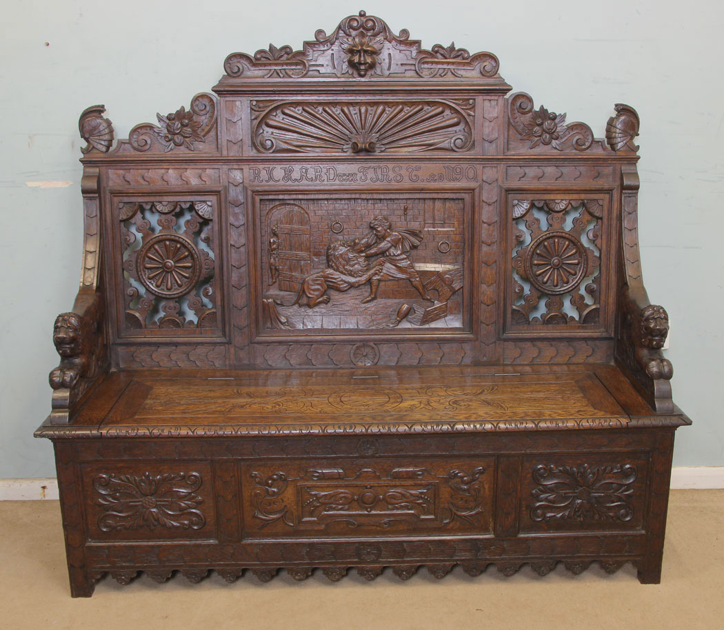 Impressive Victorian Carved Oak Settle / Monks Bench / Hall Seat (1 of 1)