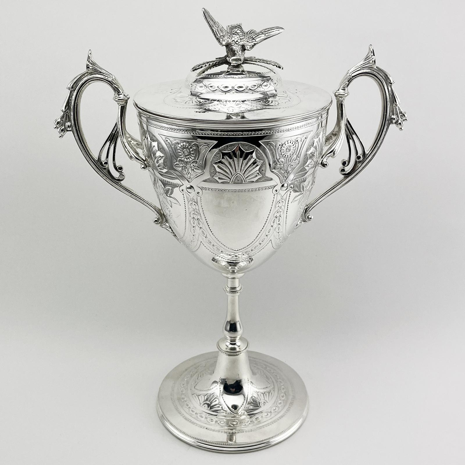 A large impressive Victorian silver plated lidded trophy cup. Domed floral engraved pull off lid with a cast bird finial. The body has been embossed with floral and garland decoration and has two vacant cartouche. Cast floral scroll handles standing on knopped beaded stem and a floral embossed circular foot. Very good re silver plated condition without any inscriptions.