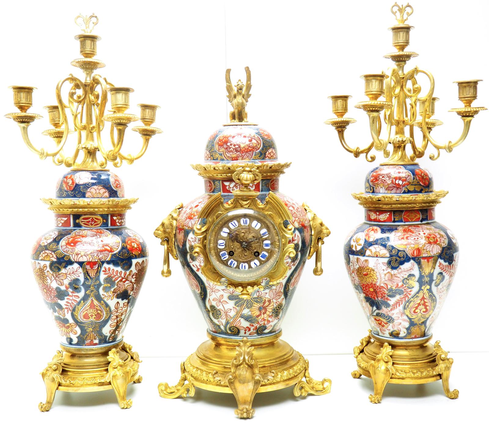 Incredible Imari Candelabra Mantel Clock Set Japanese Porcelain & Ormolu Mantle Clock