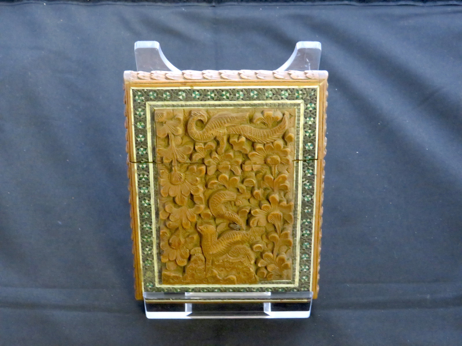 Indian Sandalwood & Damascened Metal Card Case, Carved Foliage & Animals, Mid 19th Century