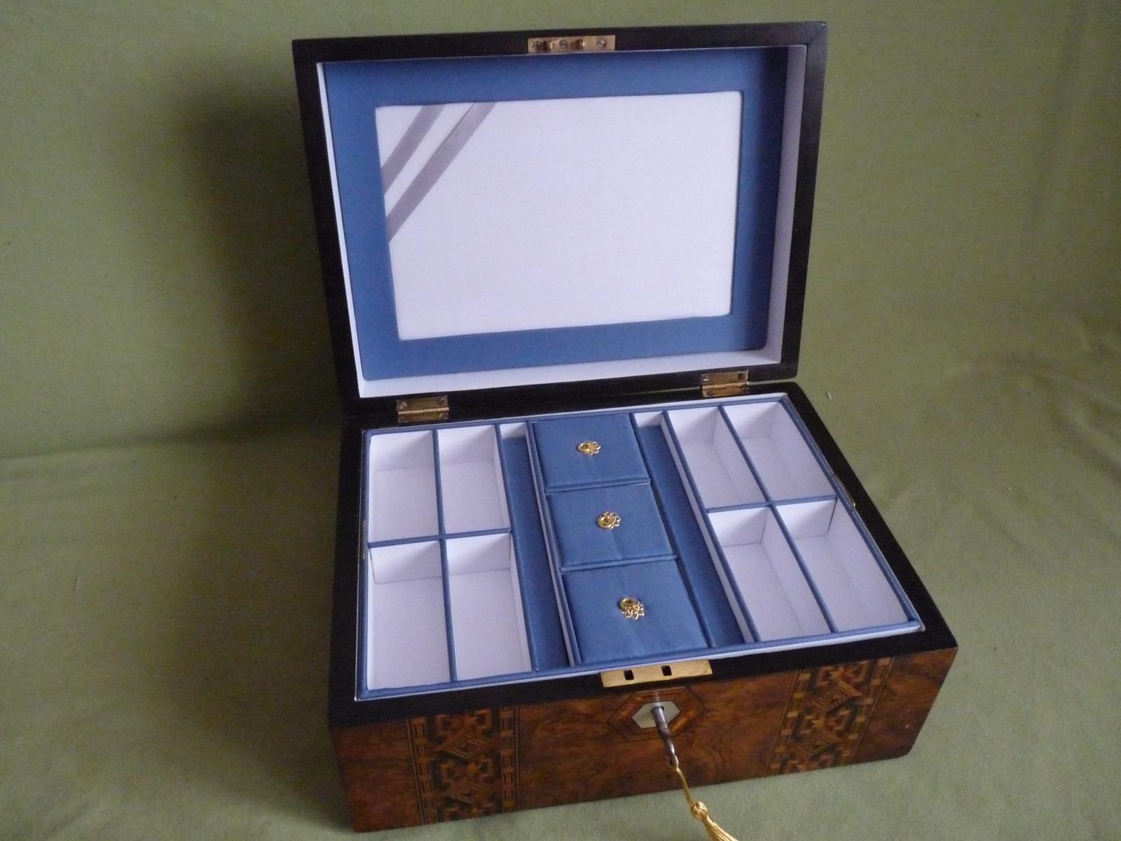 Inlaid Burr Walnut Jewellery Box + Tray c.1880