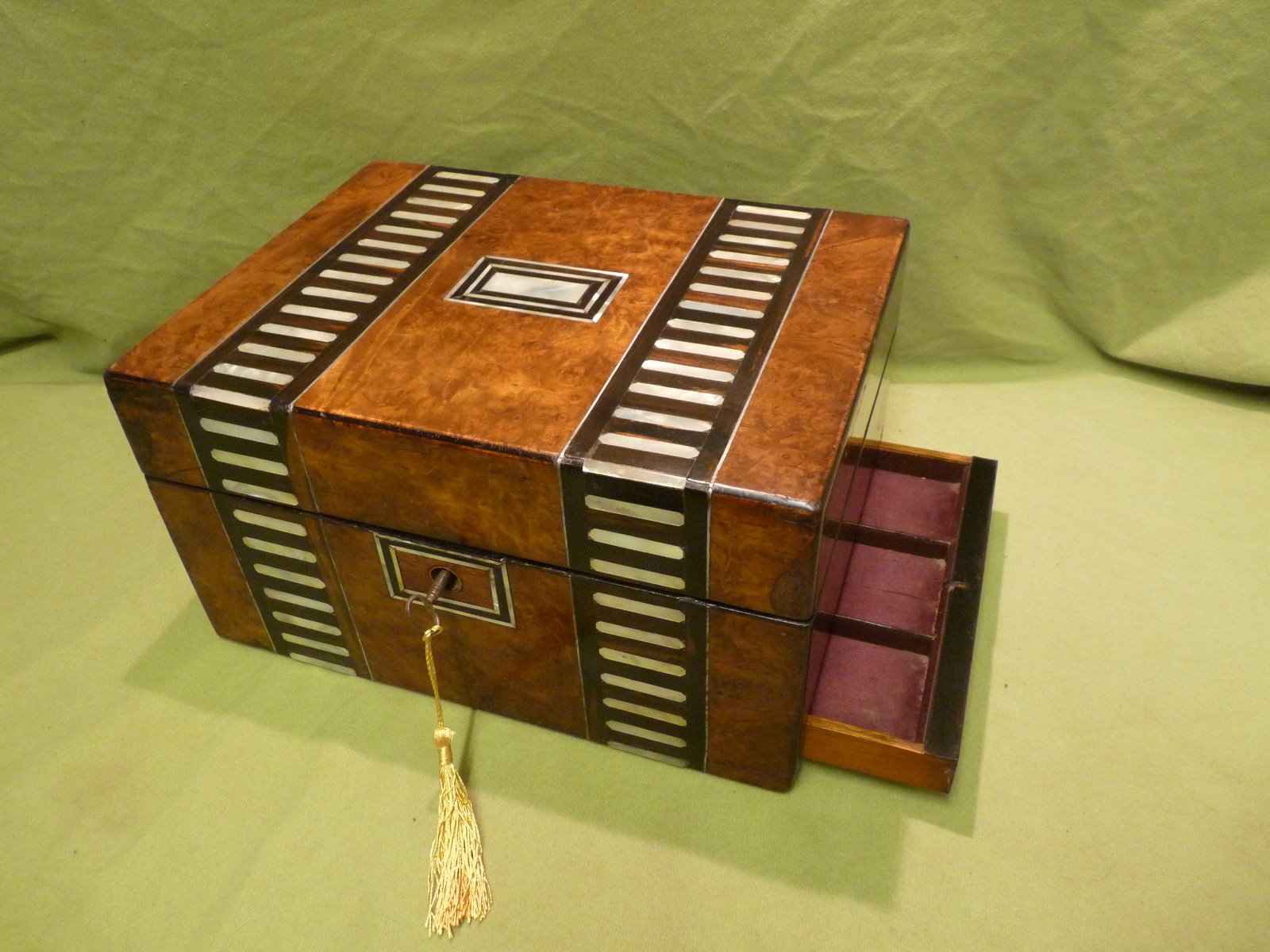 Inlaid Burr Walnut Jewellery Box. Tray + Drawer c.1875