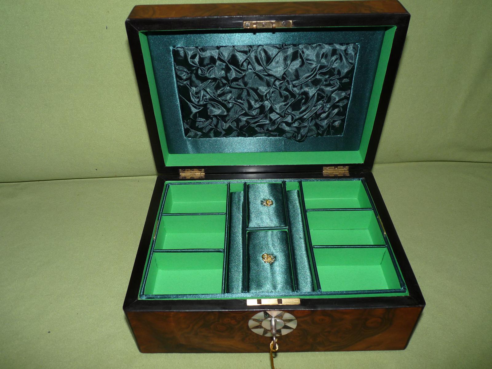 Inlaid Burr Walnut Jewellery Box + Tray. Plush Interior c.1870