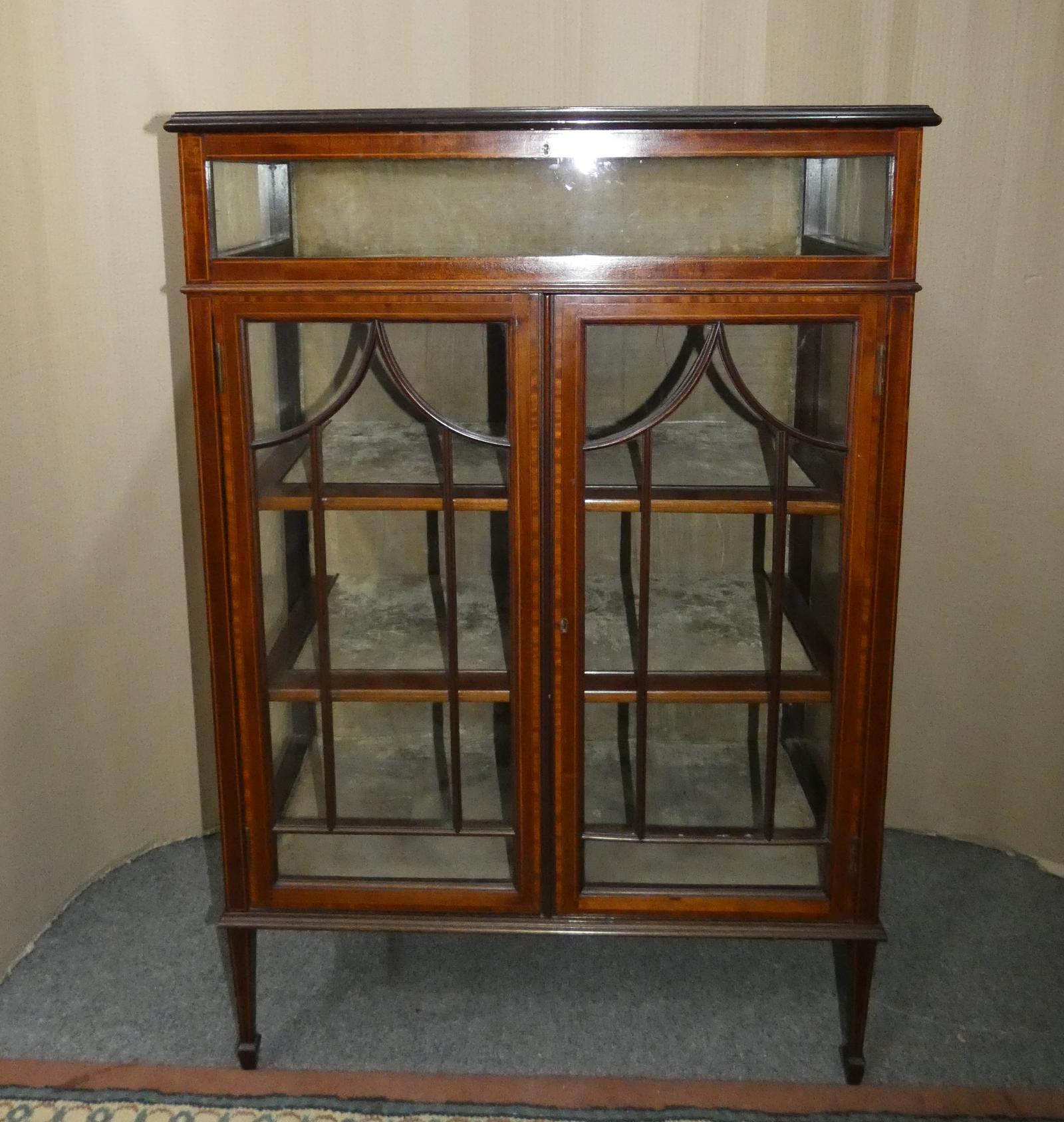 Good quality mahogany bijouterie cabinet with satinwood crossbanding and boxwood stringing inlay detail. The lift up lid ( working lock & key) opening to original velvet lined interior with two astragal glazed doors below ( working lock & key ) opening to shelved interior, again with the original velvet lining, raised on elegant square tapering legs with spade feet.