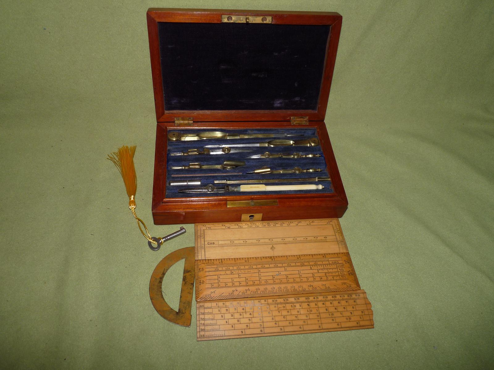 Inlaid Mahogany Boxed Set of Architects Drawing Instruments c.1890