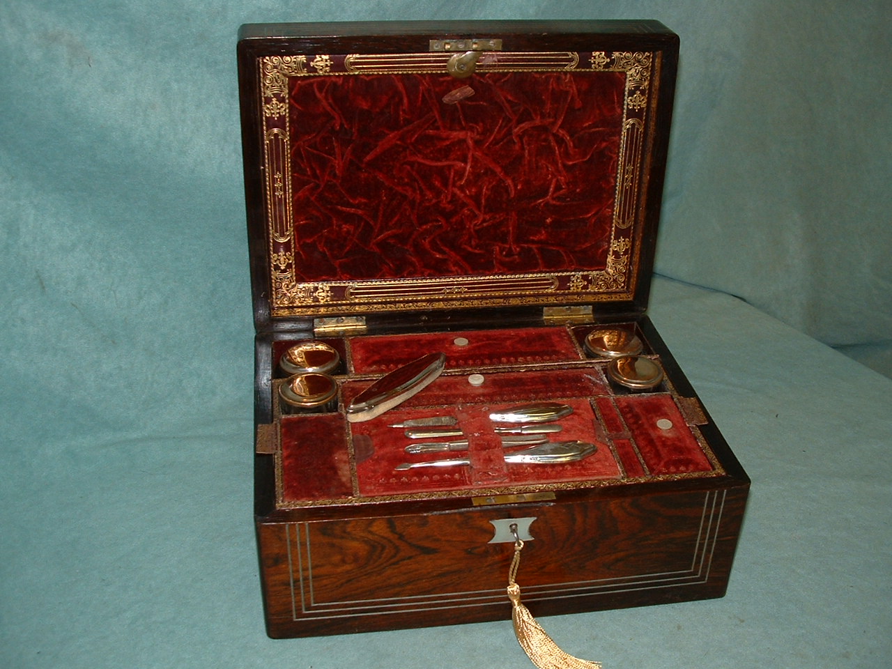 Inlaid Rosewood Fitted Vanity Box, Gilt Edged Interior c.1850