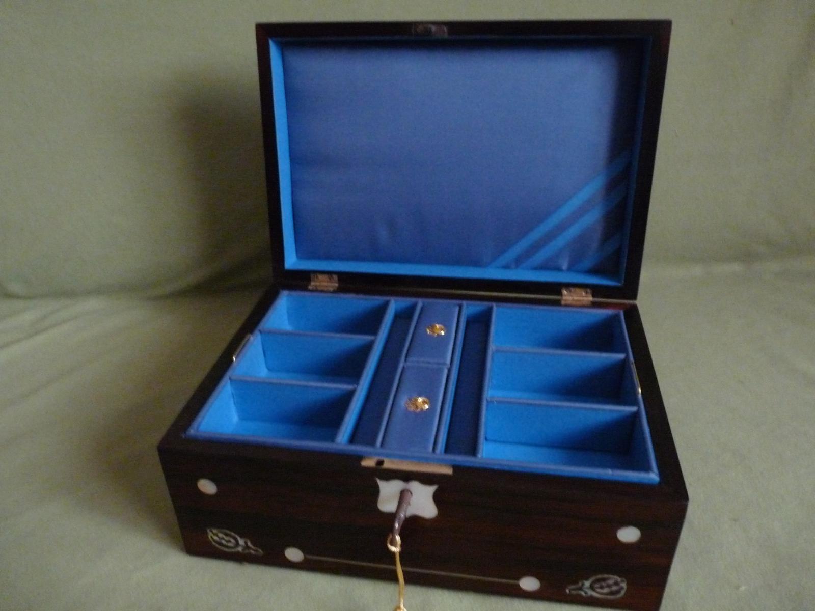 Inlaid Rosewood Jewellery Box + Tray. Plush Interior. C1860