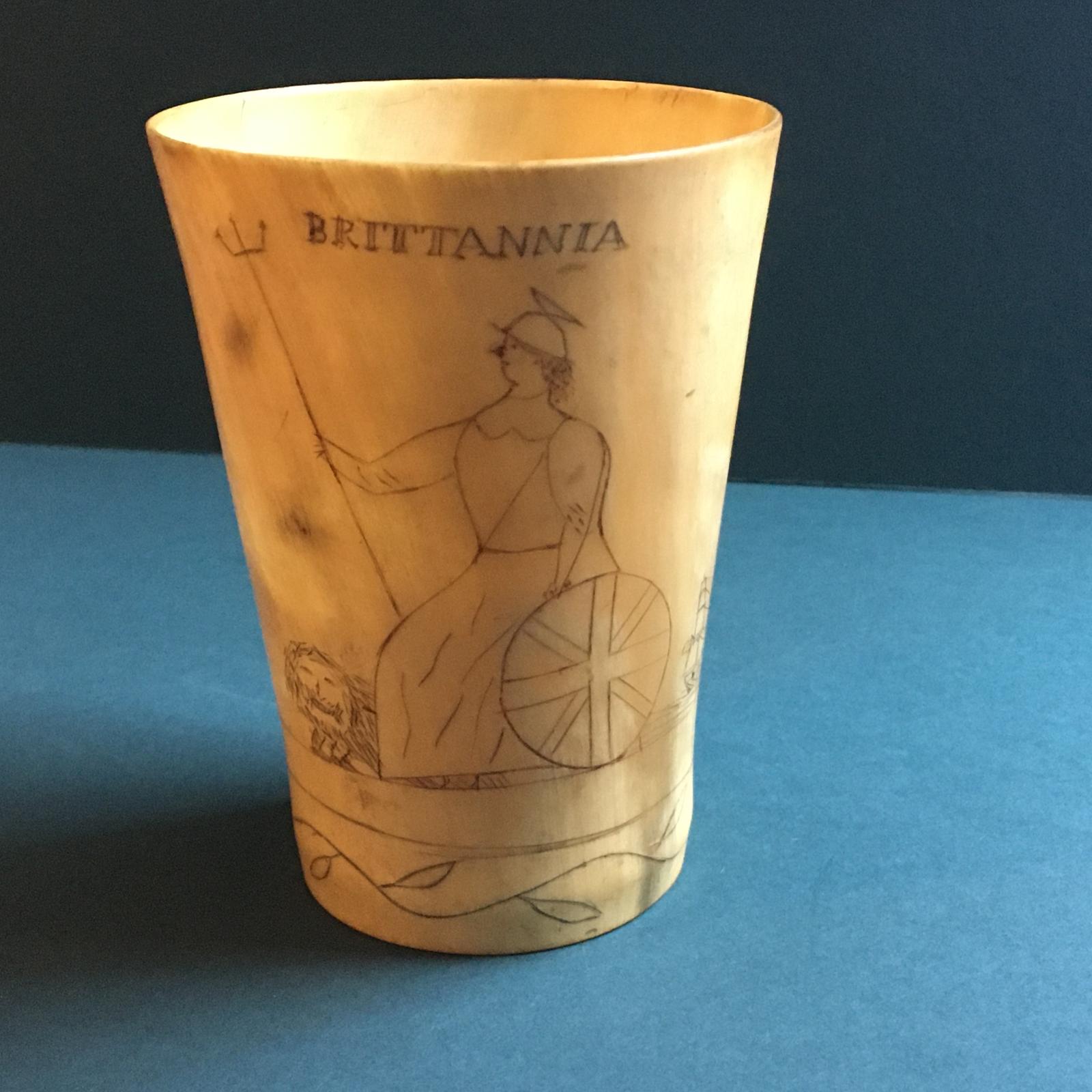 Interesting Horn Beaker Scratch Engraved with Britannia & Sailor **we dont accept ivory on the site**