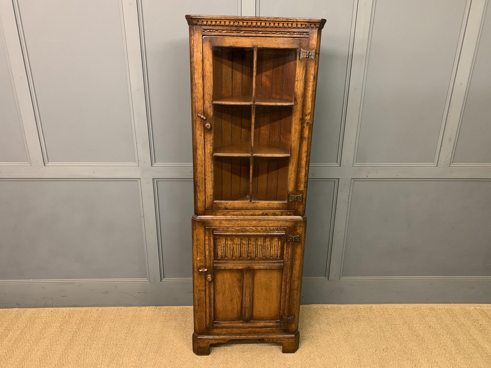 A good quality Ipswich Oak corner cabinet, or cupboard. Very well made from solid English oak, now with a lovely mellow colour and patina. There is a single glazed door to the top which opens to access a shelved interior. To the bottom there is a single cupboard door which opens to reveal further shelved storage space. The cabinet is decorated with carved detailing and is offered for sale in excellent original condition, ready to go straight into the home.
