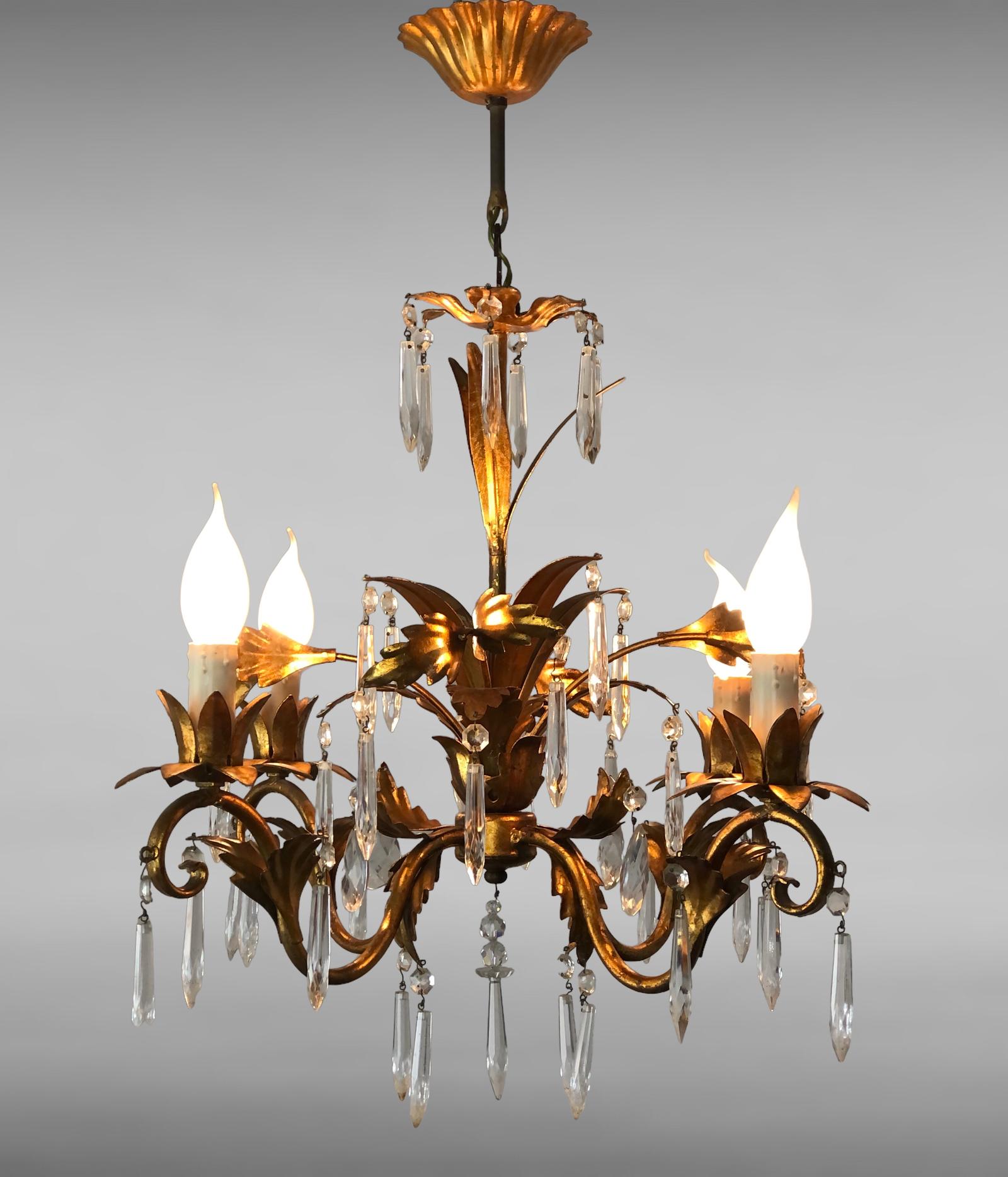 Italian Gilt Toleware Chandelier With Crystal Droplets