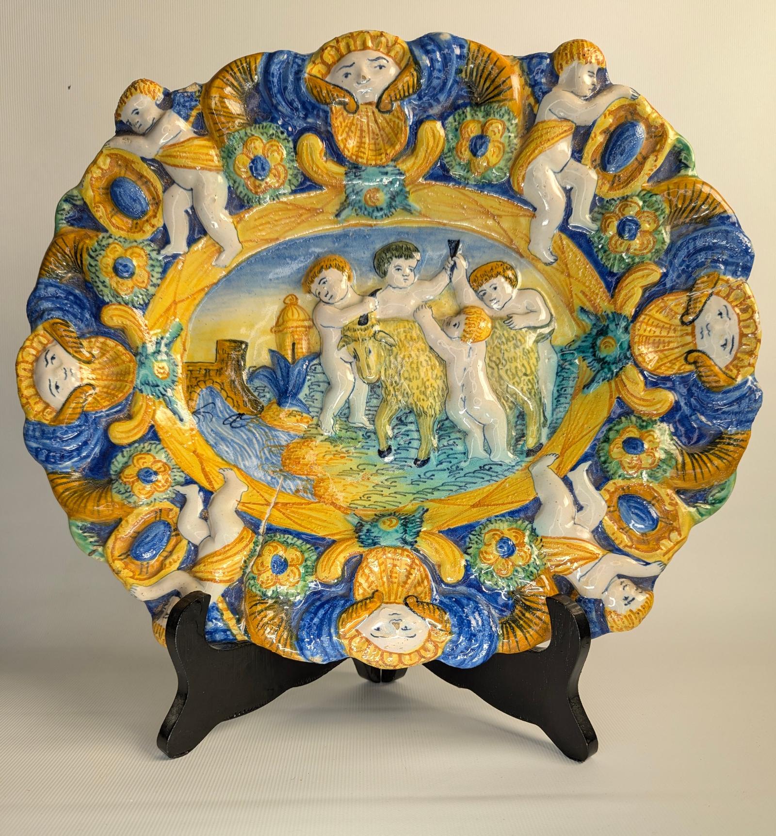 This oval-shaped Majolica plate is decorated with Polychrome relief work. To the outer rim has Masks & Putti's while the centre has four Putti's surrounding a lamb or goat. All finished with the typical colours.