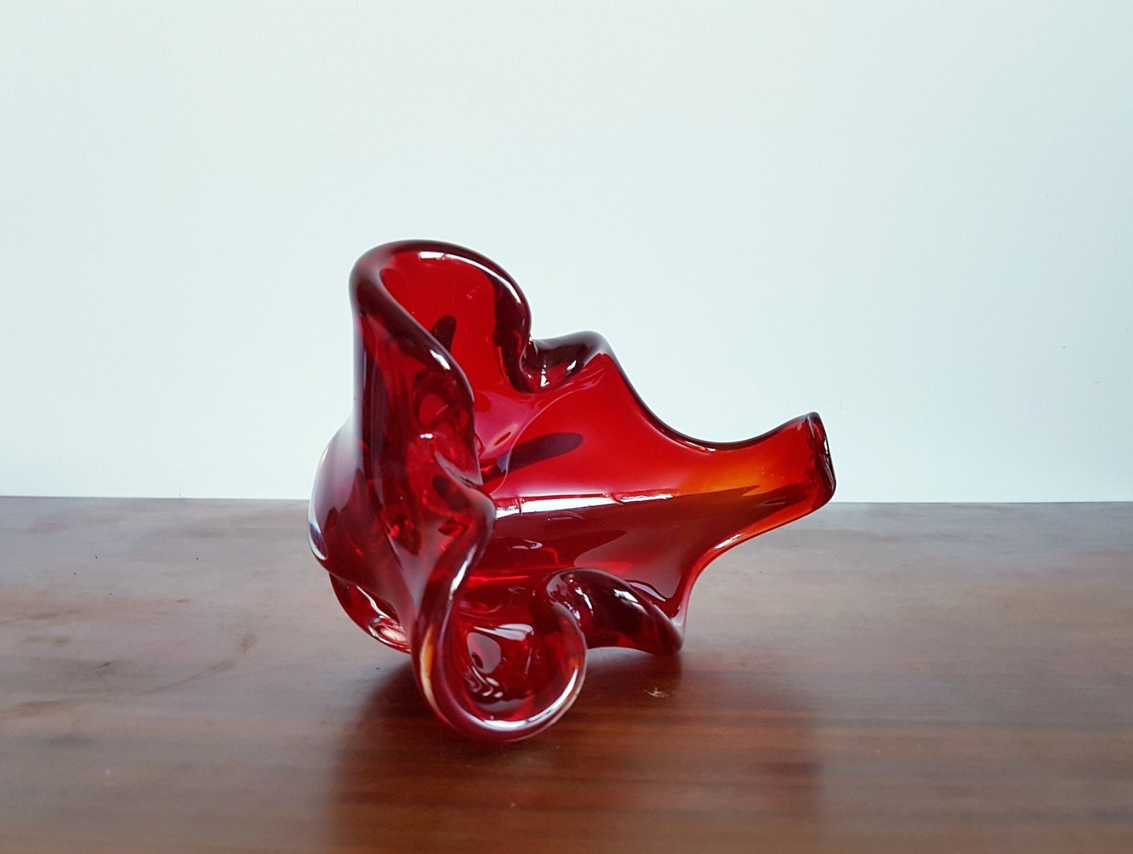 Italian Murano Red & Amber Sculpted Art Glass Dish - Att. Fratelli Toso